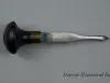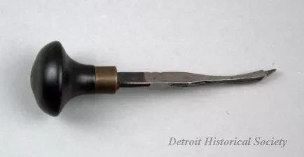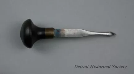 One watchmaker's/jeweler's metal engraving tool. It has a mushroom-shaped wooden handle with a brass cap and metal blade. The blade tapers inward and then outward at the tip. The tip is curved slightly and has a sharp point. The initials, "DK," are inscribed on one side of the blade near the base.