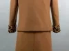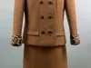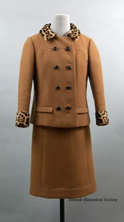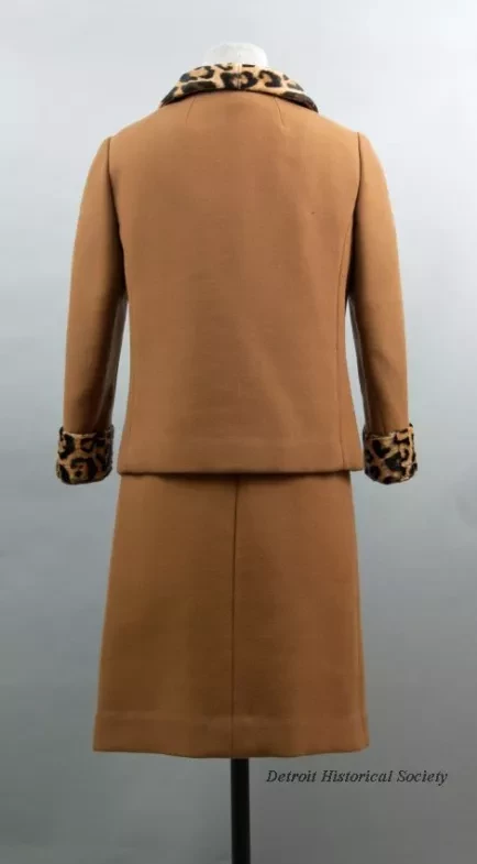 One lady's dress and jacket ensemble made of heavyweight wool fabric in a medium brown color. The sleeveless shift-style dress has a small round neckline, slash pockets on each side in front, a rayon/silk lining, a zipper closure at the back, and a hemline ending at the knee. The jacket has a pointed collar made of faux leopard fur, long sleeves with matching faux leopard fur cuffs, a double-breasted front with eight black plastic buttons, faux flap pockets on each side in front, a rayon/silk lining, and a straight cut on the hemline. A label on the inside back collar reads "Ruth Joyce Originals, Detroit."