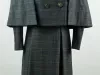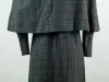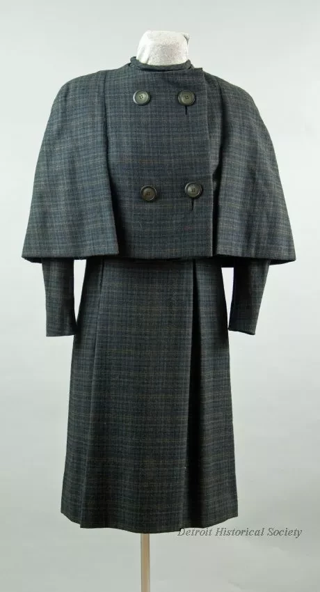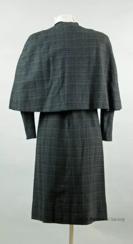 One lady's dress and jacket ensemble made of wool fabric that has a subtle blue/green/black plaid pattern. The dress has a jewel neckline with narrow collar, long sleeves with plain cuffs, two pleats in front with no waistline, a zipper closure at the back, no lining, and a hemline ending at the knee. The cape-style jacket has a small round neckline with no collar, elbow-length sleeves, a double-breasted front with four large black plastic buttons, and a rayon/acetate lining. The ensemblee was made by Ruth Joyce although a maker's label is not shown.