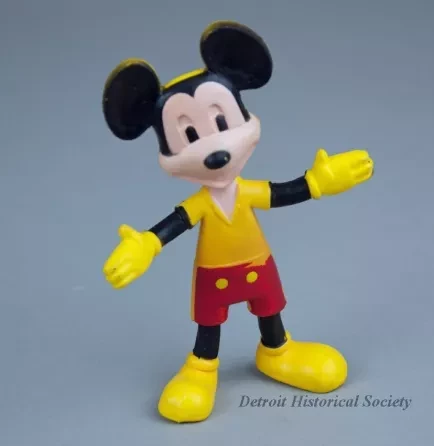 Mickey Mouse doll figure made of soft plastic. Shoes, gloves and shirt are painted yellow. Has red pants, pink face, black arms, legs and ears. Stamped "Walt Disney Productions Mfg. for Lakeside Ind. Inc., Made in Hong Kong."