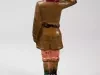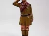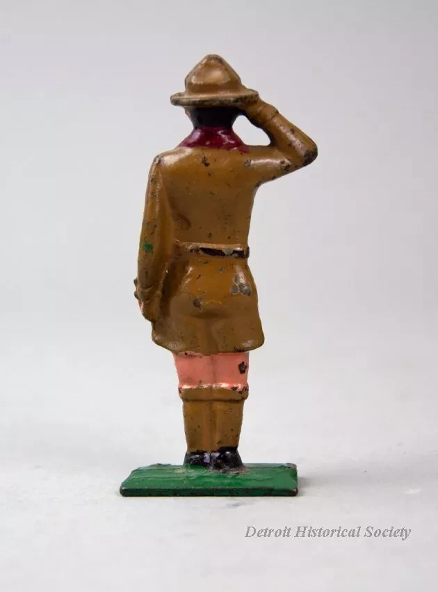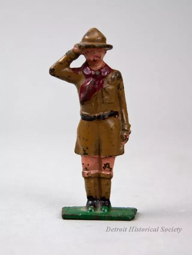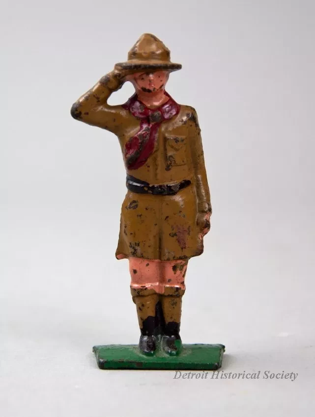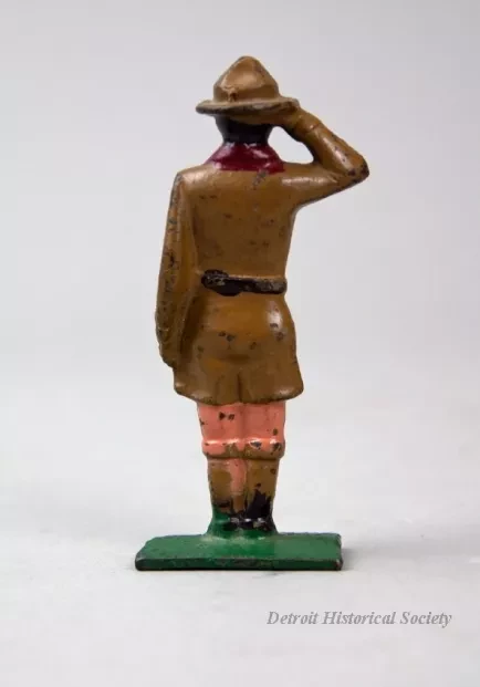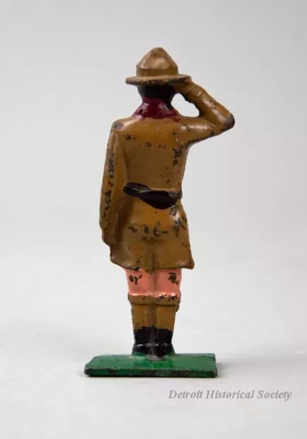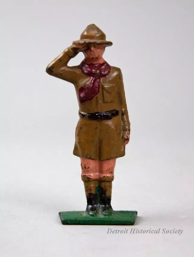 3 toy figures of Boy Scouts, made of cast lead. Painted figures are wearing summer uniforms consisting of mustard brown short pants, shirt, socks, and hat. Each has a red neckerchief and is saluting with the right arm. Figures have rectangular bases that are painted green.