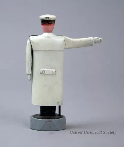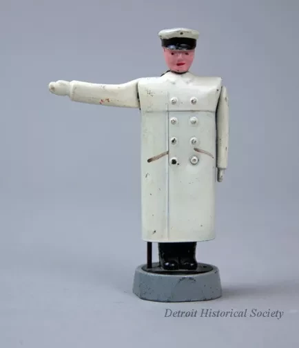 Toy figure of a doorman made of cast metal. Figure has a long white double-breasted coat, white cap with black visor, black pants, and black shoes. Right arm can be extended outward to side or can be raised overhead to flag traffic. Figure swivels on base.