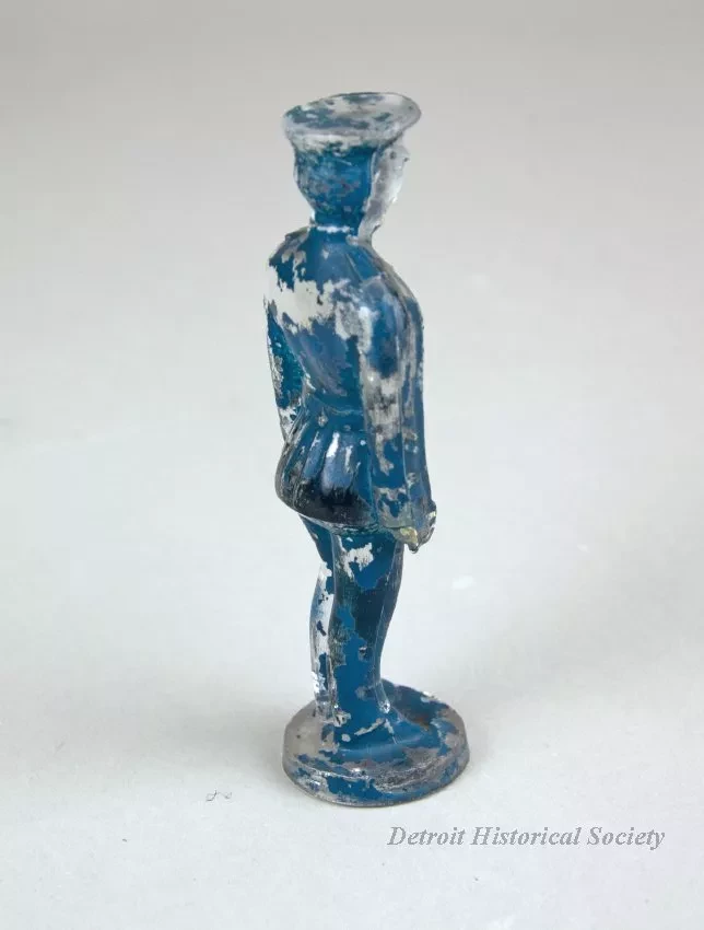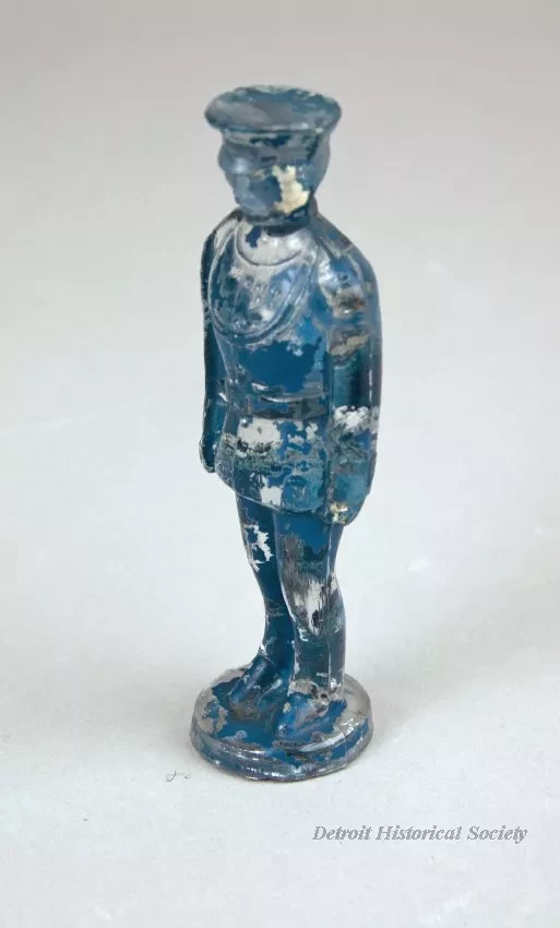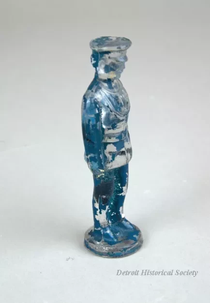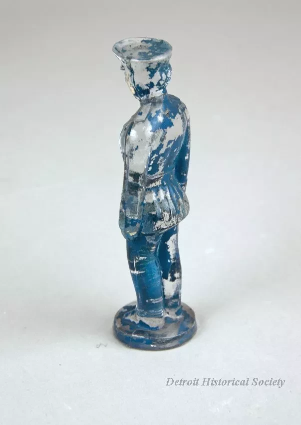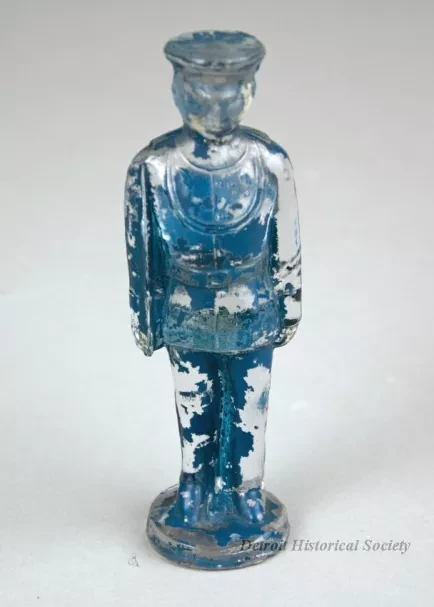 Figure made of clear molded glass. Depicts a policeman or possibly a military man that is standing on a circular base. Originally painted blue with white face and hands.