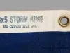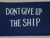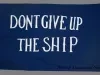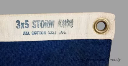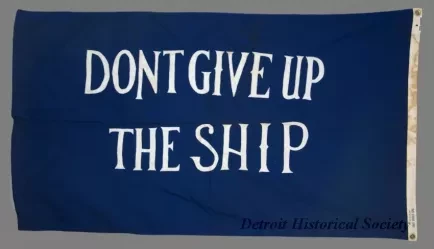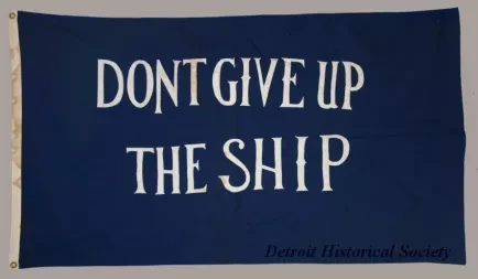 Flag. Cotton flag after one used by Commodore Oliver Perry on Lake Erie during War of 1812. Consists of blue field with legend of "Don't Give Up The Ship," in white. Canvas strip with two brass grommets along hoist.