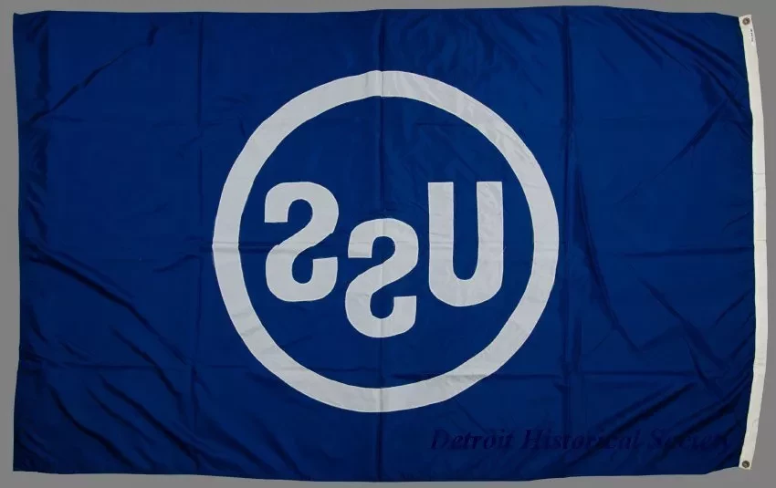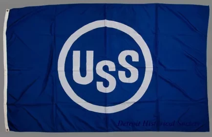 Company flag from the USS (United States Steel) Company steamship fleet. The flag is dark blue and shows the "USS" logo in white at the center. It is made of nylon and is rectangular shape. The hoist edge of the flag is reinforced with a heavy white nylon binding and has brass grommets at the corners. No manufacturer's label or stamp is shown.