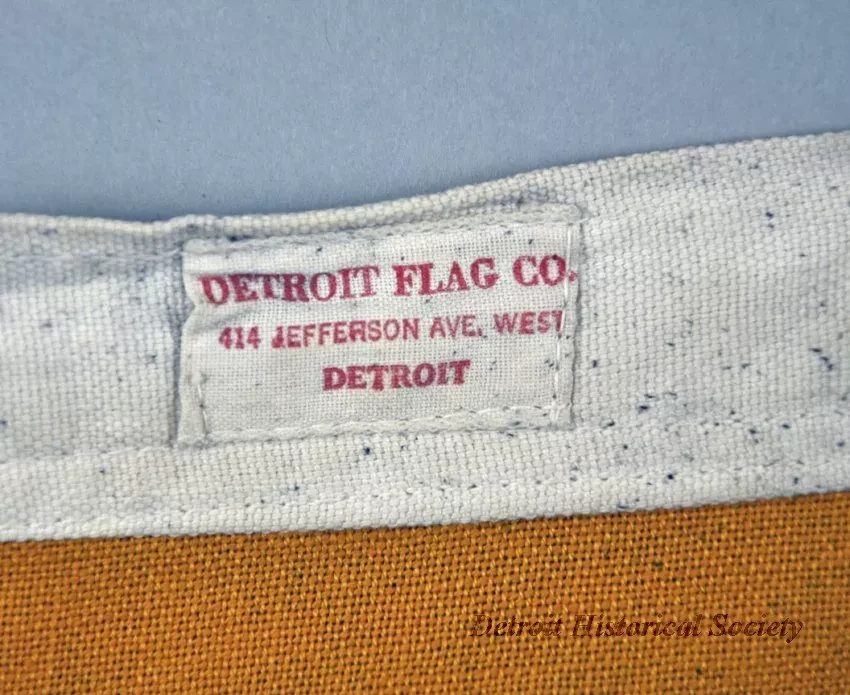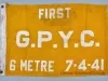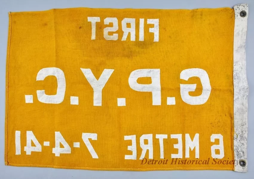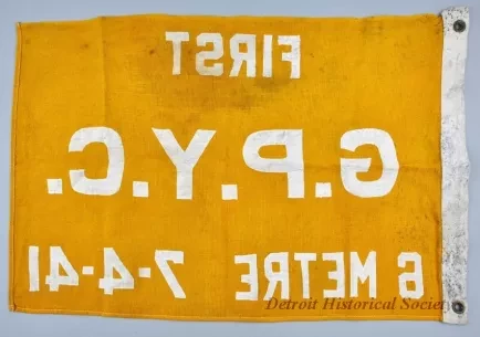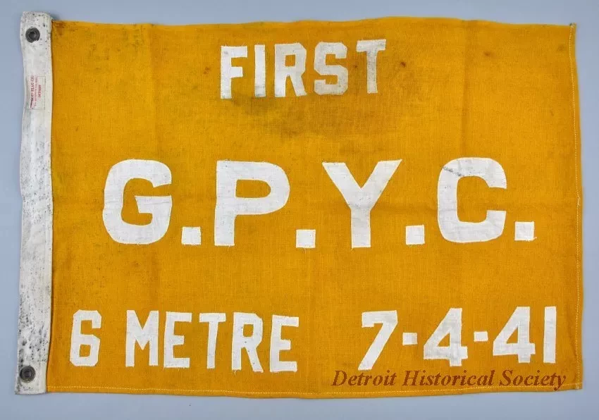 One award flag from a sailboat race on Lake St. Clair. The rectangular flag is made of medium weight yellow cotton fabric. White appliqué text is sewn on both sides of the flag that reads "First, G.P.Y.C. [Grosse Pointe Yacht Club], 6 Metre, 7-4-41." The hoist edge is reinforced with a double layer strip of white canvas. Brass grommets are located at the top and bottom ends of the reinforcing strip. The top, bottom, and outer edges of the flag are all sewn with a narrow rolled hem in order to minimize tears and fabric fraying. A sewn label on the hoist edge has red text that reads "Detroit Flag Co., 414 Jefferson Ave. West, Detroit."