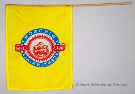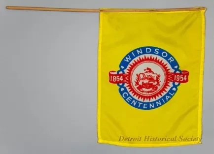 One small souvenir flag from the Windsor, Ontario, centennial celebration. The rectangular flag is made of thin yellow nylon fabric that is stamped with a red and white image of the City seal at the center. Blue and red bands around the seal have white printed text that reads "Windsor Centennial, 1854 - 1954." The flag is nailed to an unfinished wood dowel/stick. No manufacturer's name or marks are shown.