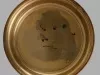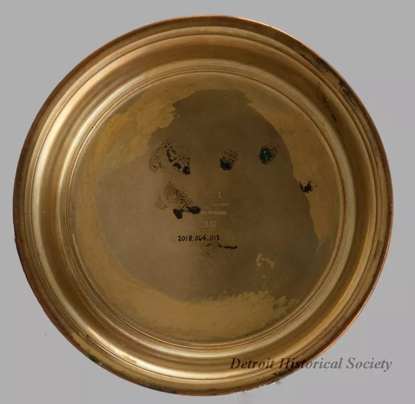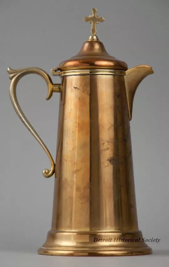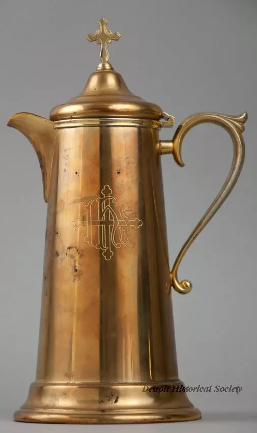 One sacramental wine flagon used at St. James Lutheran Church which was located at the southwest corner of Lyndon Avenue and Southfield Road in Detroit. The flagon is cyclindrical in shape and is made of gold-plated silver. It has a narrow top with a hinged lid, a short covered spout, a decorative curved handle with a thumb rest, and straight sides that flare outward slightly to form a wide decorative base. A cross and the letters, "IHS," are engraved on one side of the flagon. The handle on the hinged lid consists of a small cross at the top center. Engraved lettering on the underside of the flagon base reads "E2001, silver soldered, Pat. Pending," and "IS [International Silver]."