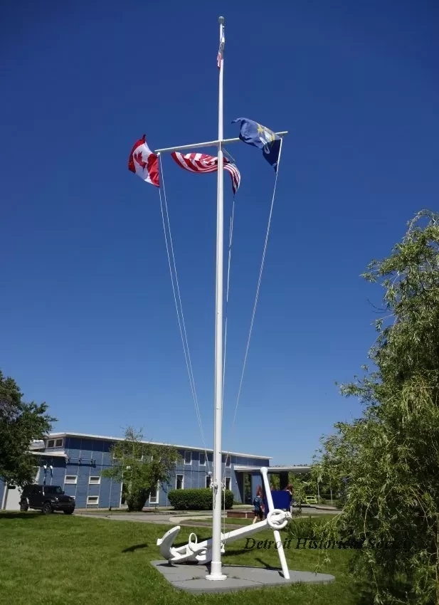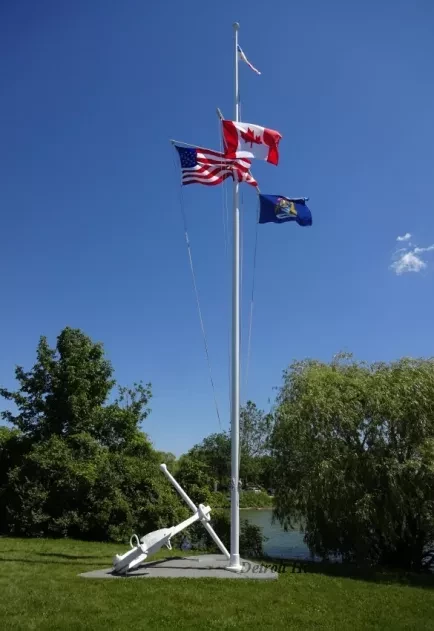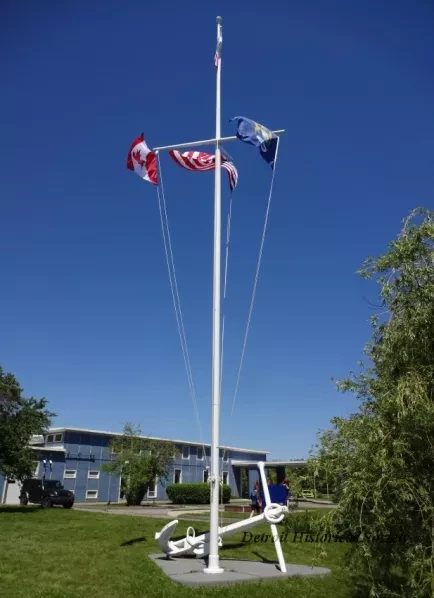 One 50-foot tall nautical-style flagpole with a yardarm and gaff. The pole is made of steel that is 6 inches in diameter at the base and tapers to about 3 inches in diameter at the top. The base is set in a concrete foundation and is located near one of the rounded corners of a large triangular concrete slab on grade. A rectangular brass plaque is mounted in the concrete slab and has raised text that reads "Gift of Detroit News, 1960." A decorative steel ball is located at the top of the flagpole and a decorative collar is located on the slab surface at the base. A steel yardarm is located at about the 3/4 point of the pole with a gaff arm in front. Pulleys with halyards are located at the top, at the ends of the yardarm, and at the end of the gaff. Four cleats (one for each halyard) are located on the sides of the flagpole about 4 feet above the base. The City of Detroit flag is flying at the top of the flagpole, the American flag is flying at the end of the gaff, and the Canadian and State of Michigan flags are flying at opposite ends of the yardarm. The flagpole and fittings are all painted white. No manufacturer's markings are visible on the pole.