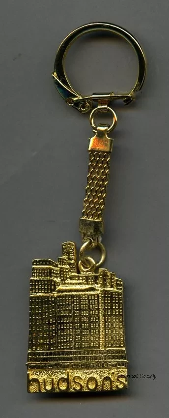 One commemorative key fob that features Hudson's downtown Detroit department store. The gold-colored metal fob consists of a small metal sheet that has a stamped image of the storefront and is attached to a short length of mesh-style chain. A key ring with a spring clasp closure is attached to the other end of the chain.