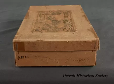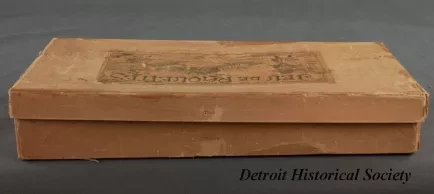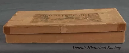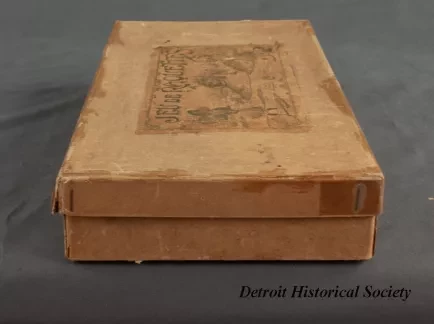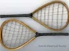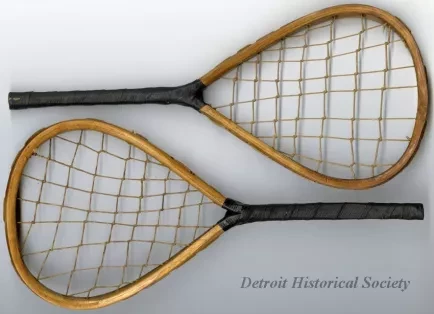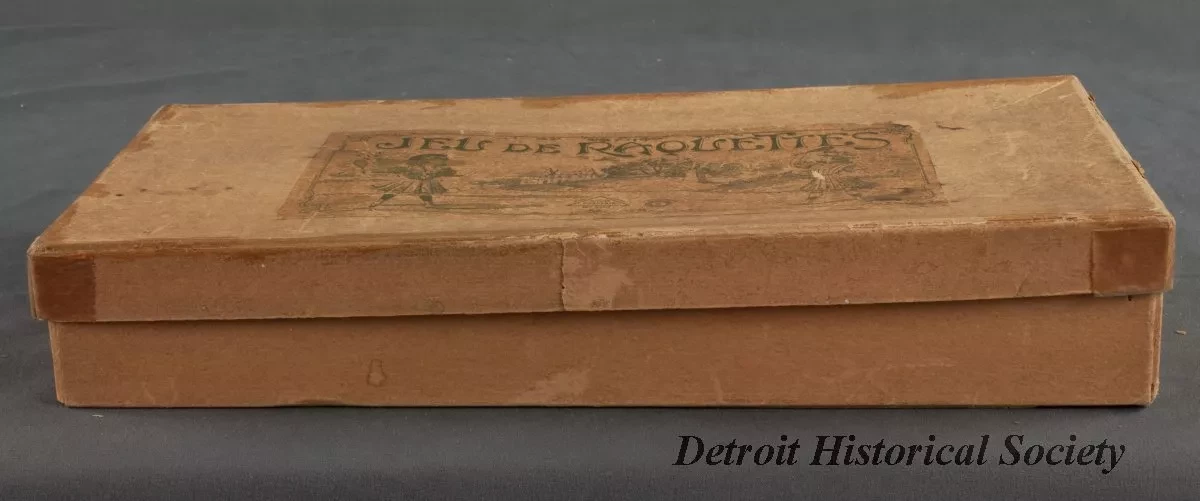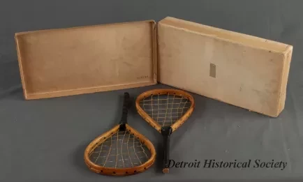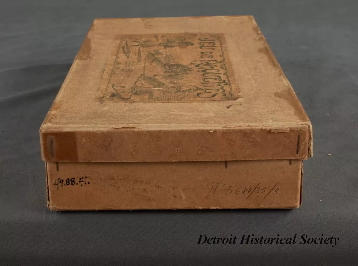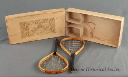 A French boxed badminton set, entitled "JEU DE RAQUETTES." The box is brown and features and illustration of two girls playing badminton in front of a castle and trees. The contents of the box includes two small rackets with black tape handles and two shuttlecocks made of white feather cork.
