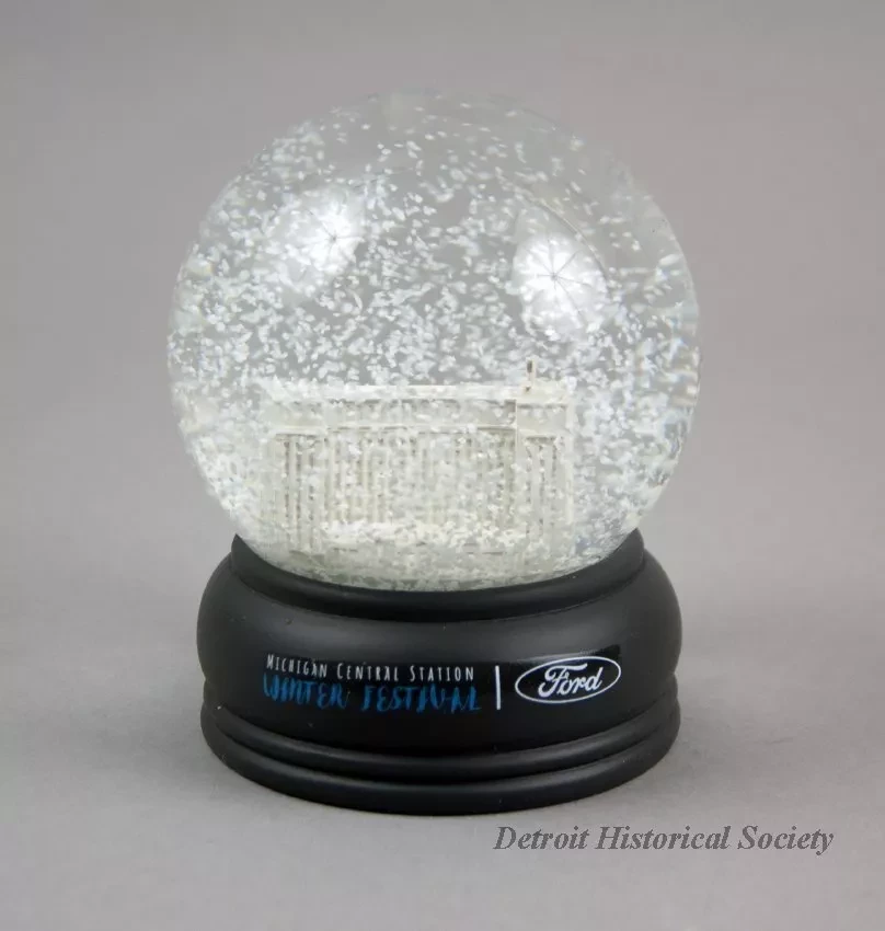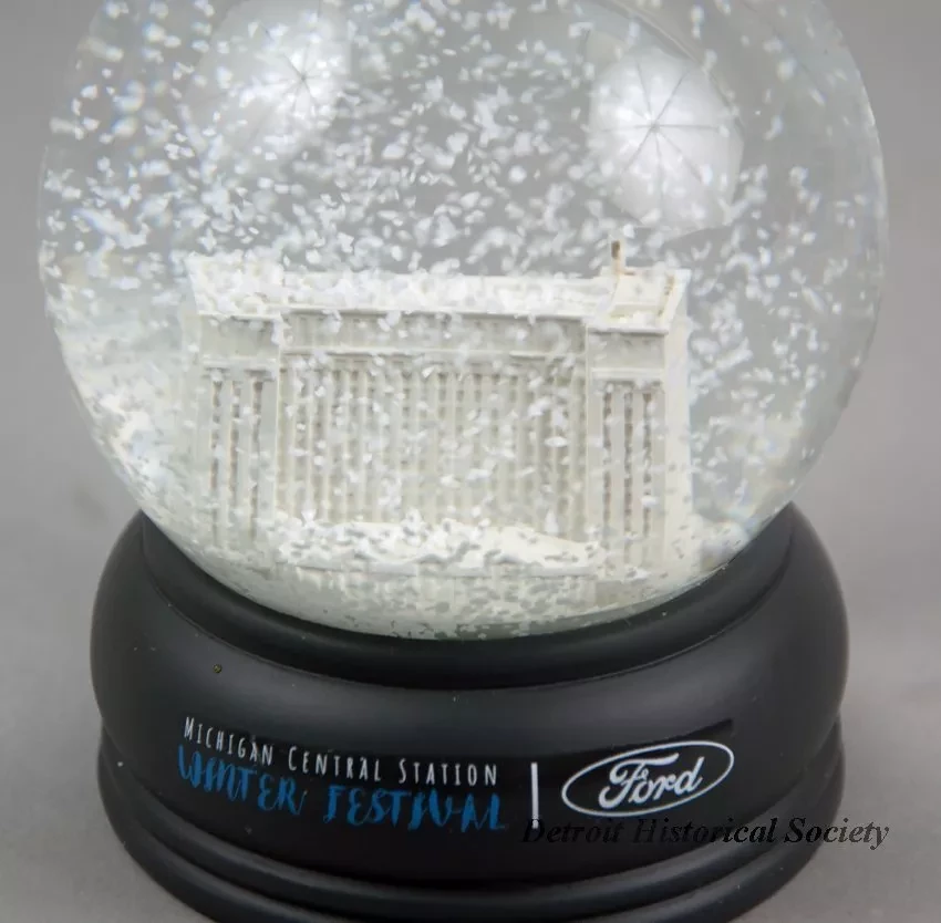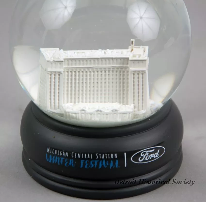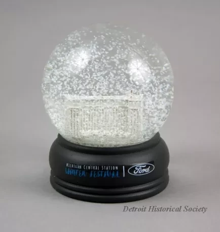 One snow globe from the January, 2019, Winter Festival in the Corktown neighborhood of Detroit. The snow globe consists of a clear glass sphere that contains a white plastic model of the Michigan Central Depot along with a clear liquid and snow-like particles. The sphere is attached to a decorative charcoal gray plastic base that has a decal on one side that reads "Michigan Central Station Winter Festival" and shows the "Ford" logo. The globe is contained in plain white cardboard box with styrofoam packing.