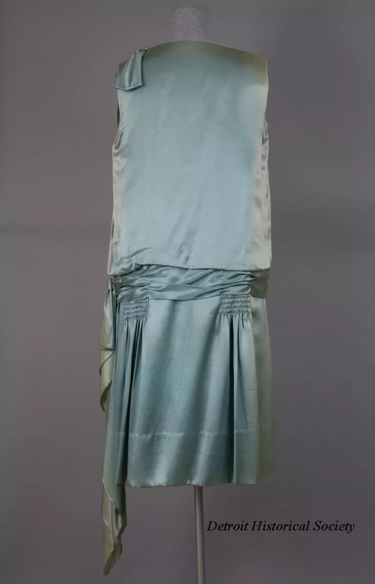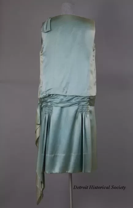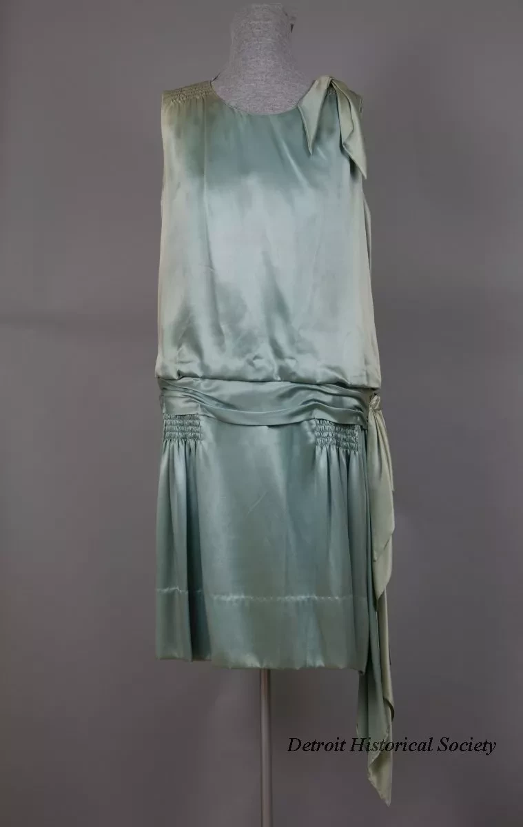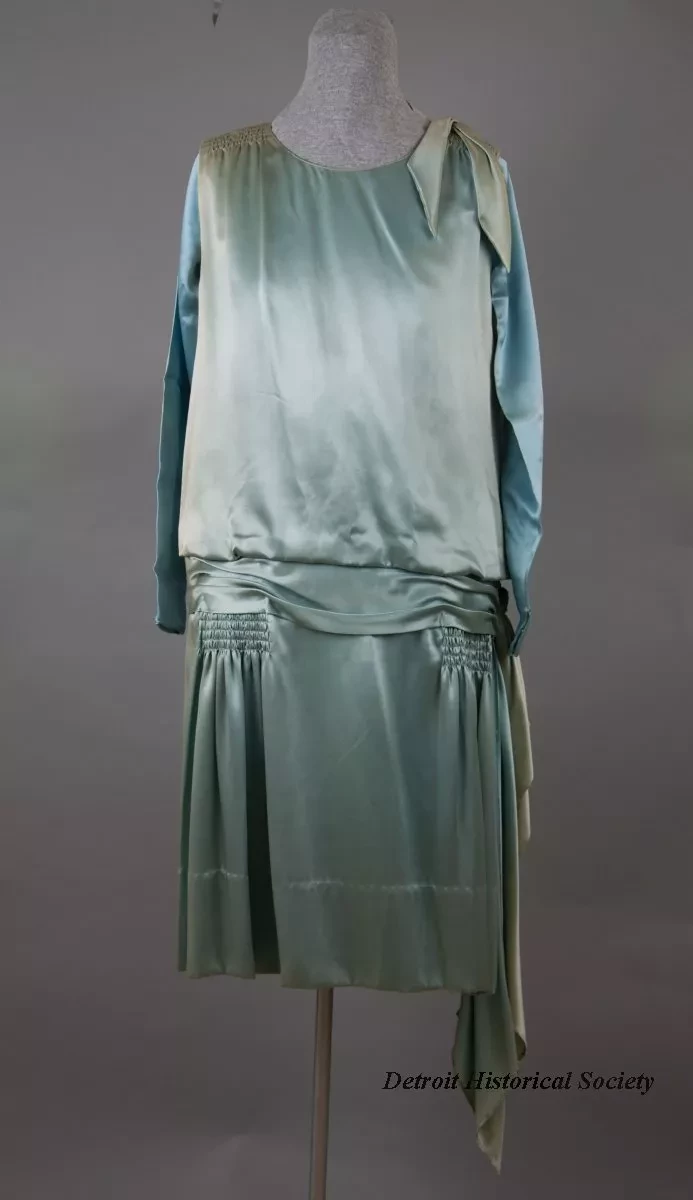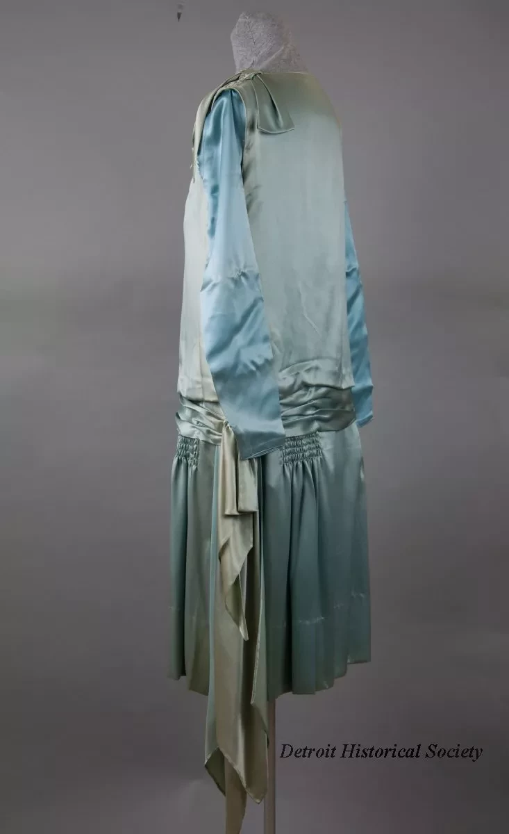 One lady's ice blue satin evening dress. The sleeveless dress has a round, cut-out neckline, a bow on the left shoulder, and a dropped waistline with a sewn-on sash which includes a bow on the left side. Smocking is located on the shoulders and on each side of the skirt at the front, below the waist. A pair of plain long sleeves are included which could be tacked in order to change the style to an afternoon dress. The skirt includes an attached slip inside that has a scalloped lower edge. No manufacturer's labels are shown.