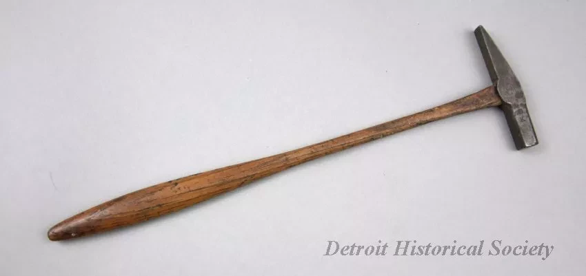 One small hammer handmade by a watchmaker. The hammer has a thin oak or ash wood handle that is slightly tapered and rounded. One end of the hammer head has an octagonal shape with a flat end. The other end is wedge-shaped. The initials, "DK," are stamped on one side of the head.