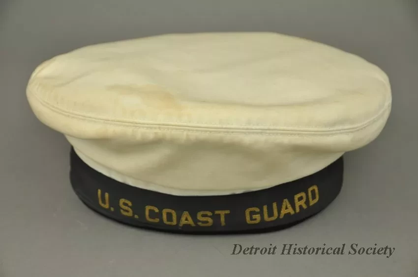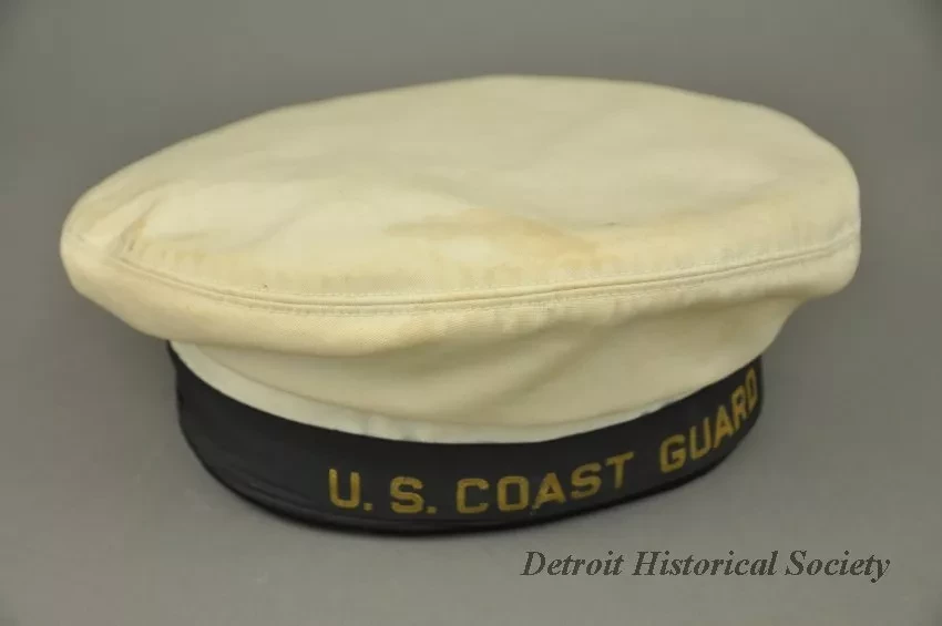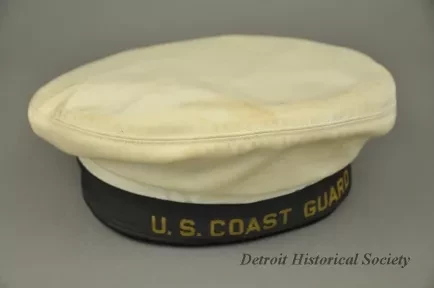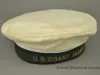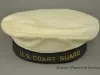 1 - Cap. U. S. Coast Guard cap that is white with black band. Text across the black band, in gold, is "U.S. kCoast Guard". Brown leather band on the interior and a logo on the inside that states "Art Caps Military Headwear".