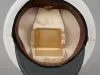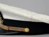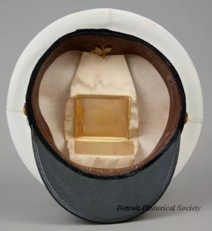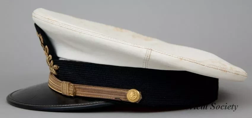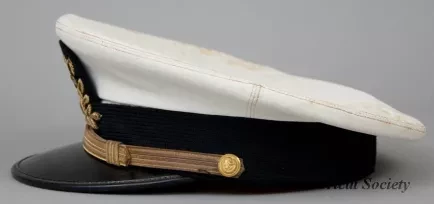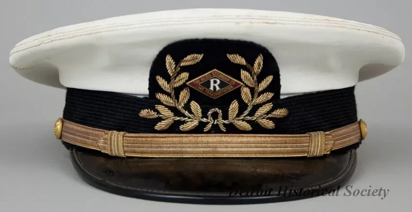 One peaked hat worn by a marine deck officer. The hat has a white vinylized fabric top, a black headband with a gold-colored strap across the front, and a black vinyl visor. The strap ends are attached at brass buttons that are located on the left and right sides of the hat. The front of the hat has a decorative embroidered emblem that includes a diamond-shaped metal pin with the "R" logo of the "Reiss Steamship Co., Lake Transportation" fleet. A white fabric and plastic label holder is located on the inside top of the hat although no manufacturer's label is shown.