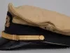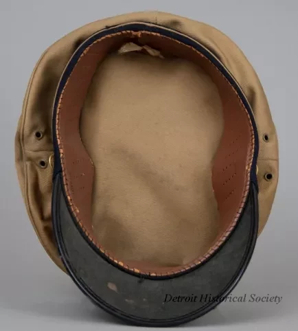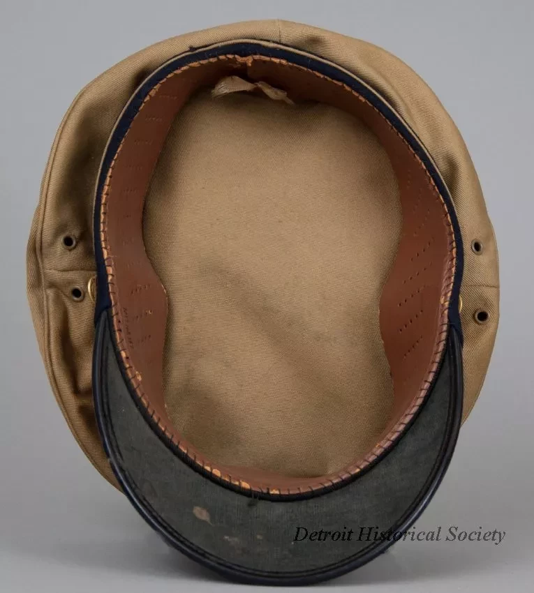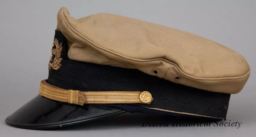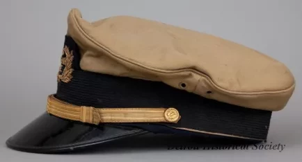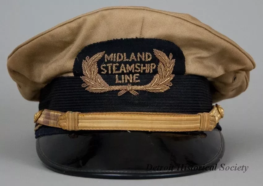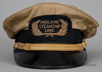 One peaked hat worn by a marine deck or engineering officer. The hat has a khaki fabric top, a black headband with a gold-colored strap across the front, and a black vinyl visor. The strap ends are attached at brass buttons that are located on the left and right sides of the hat. Two grommeted vent holes are located on each side of the fabric top just above the brass buttons. The front of the hat has a decorative embroidered emblem with text that reads "Midland Steamship Line." No manufacturer's label is shown.