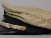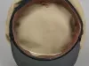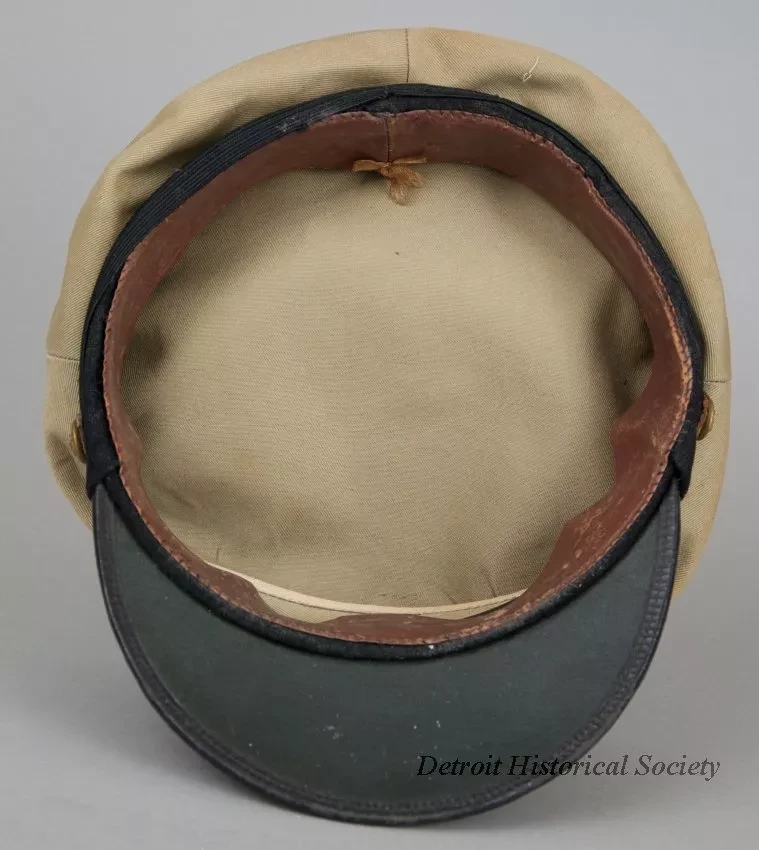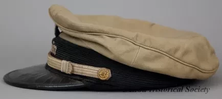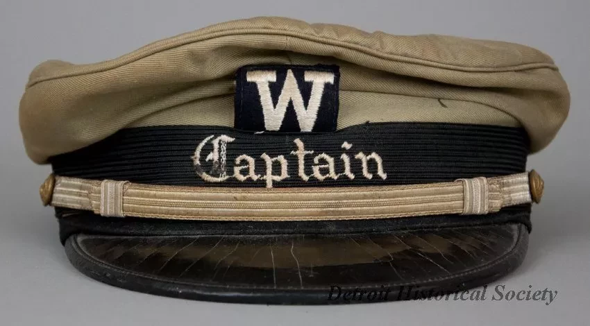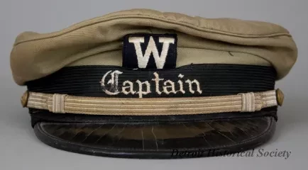 One peaked hat worn by a marine deck officer. The hat has a khaki fabric top, a black headband with a gold-colored strap across the front, and a black vinyl visor. The strap ends are attached at brass buttons that are located on the left and right sides of the hat. The front of the hat has a pale gold-colored embroidered "W" emblem of the Wilson Marine Transit Company. The word, "Captain," is shown in pale gold-colored embroidered text beneath the emblem. No manufacturer's label is shown.