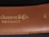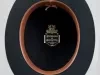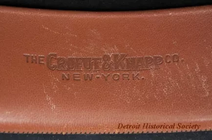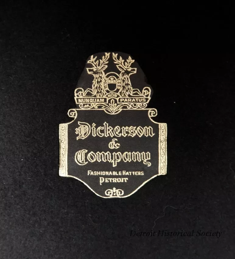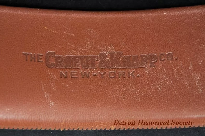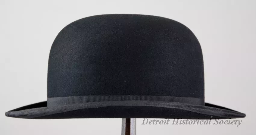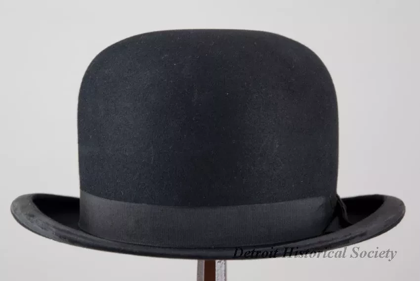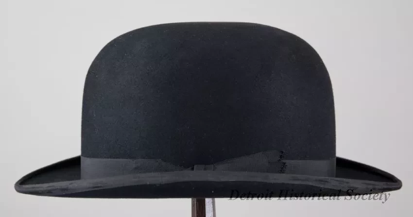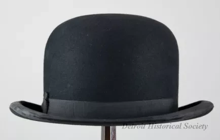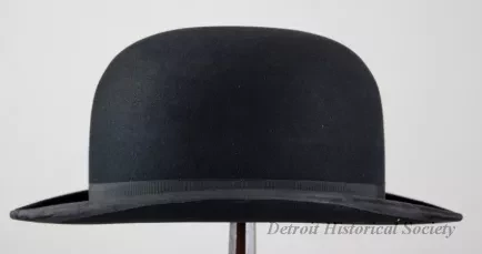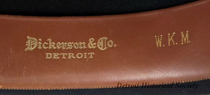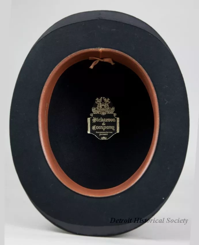 One man's derby (bowler) style hat. The hat is made of black wool and has a black grosgrain ribbon headband on the exterior with a bow on the left side. The edges of the brim are slightly upturned on the left and right sides. The interior is unlined and a decorative label at the center reads "Dickerson & Company, Fashionable Hatters, Detroit." A brown leather interior headband is stamped with gold-colored text on the left side that reads "Dickerson & Co., Detroit," and the initials, "W.K.M." Embossed text on the right side of the interior headband reads "The Crofut & Knapp Co., New York."