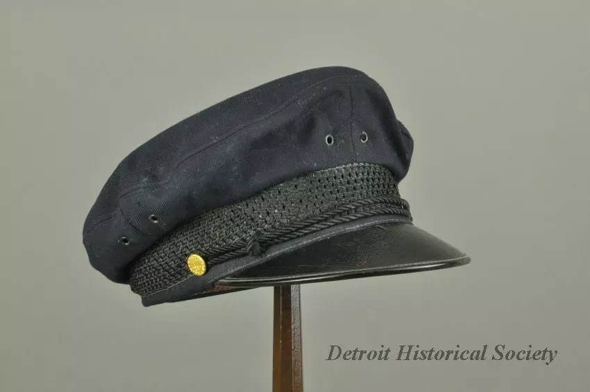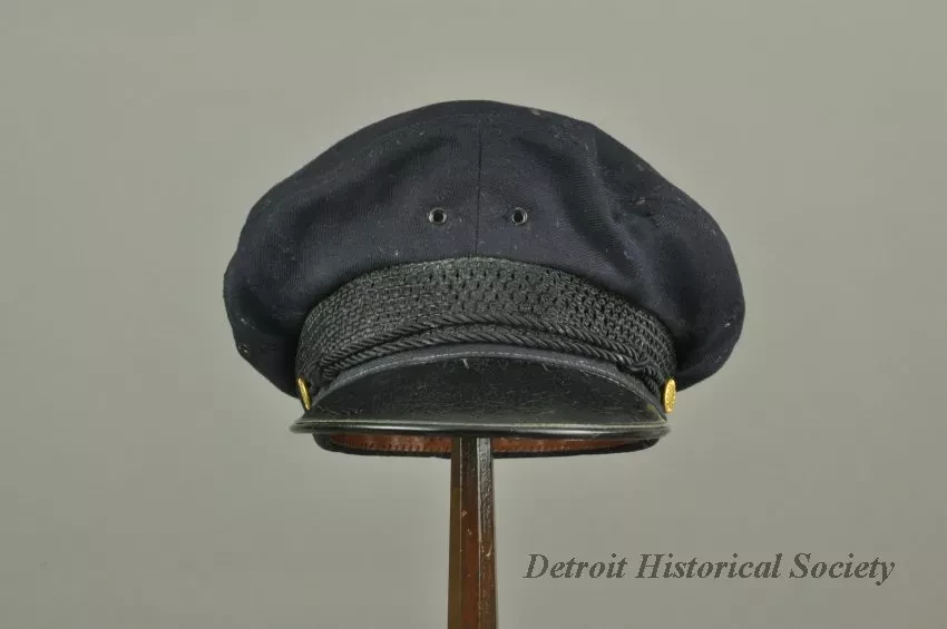One peaked hat worn by Detroit Police officer, Joseph A. Troyanek. The hat has a dark blue twill fabric top, a braided black thread headband with a black cord across the front, and a black vinyl visor. The cord ends are attached at brass buttons that are located on the left and right sides of the hat. The buttons are embossed with the police department emblem and the words, "Detroit Police." The front of the hat has two vent holes which would also be used to attach a badge. Similar vent holes are also located on the left and right sides of the hat. The hat interior has a black cloth lining and a small plastic pocket on the inside top for an owner's identification label. Three small manufacturer's labels are sewn on the inside headband and show size "7 1/8," "WPL 8893, 100% Wool Exclusive of Trimmings," and a union label (unreadable). Handwritten black text along the inside leather headband shows "Cianciolo, Dumas Ct., Farmington" and "1924-1949, Joseph A. Troyanek, Grandpa."