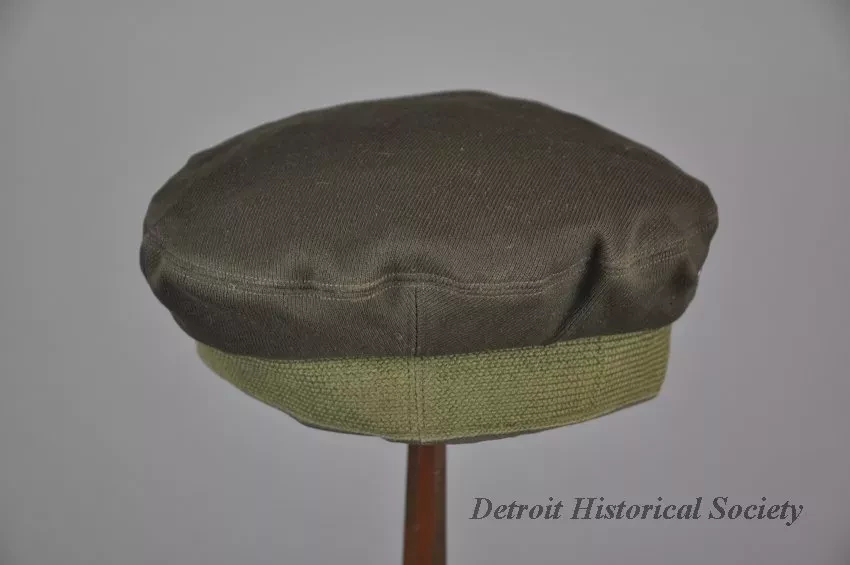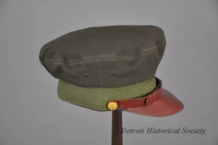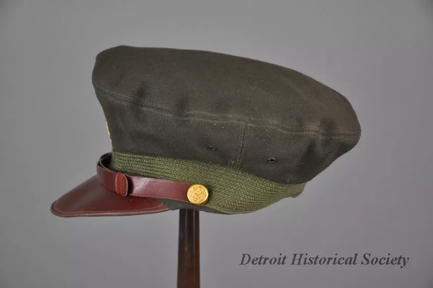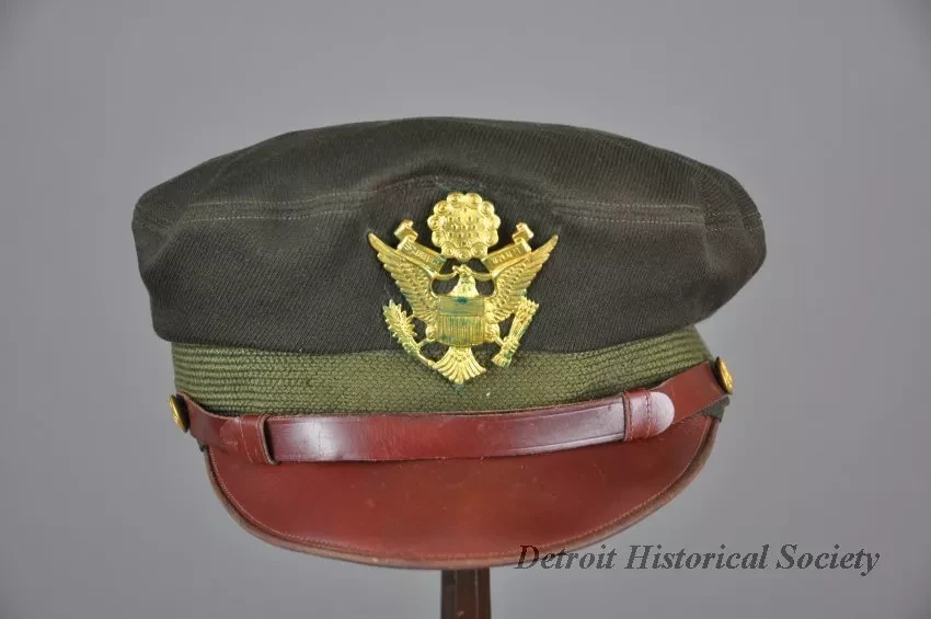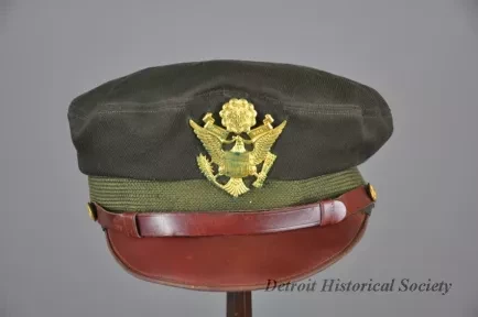 One U.S. Army Air Force peaked hat worn by Frank D. Stella. The hat has a brown wool fabric top with two grommeted vent holes on both the left and right sides. The front has a large gold-colored metal pin that depicts an American eagle and shield. Also, there is a brown leather visor at the front. The hat has a green twill fabric headband on the exterior with a brown leather strap across the front. The strap ends are attached at the left and right sides of the hat with a small brass button which has an eagle insignia. The interior headband is made of brown leather and has gold-colored text that shows "Curve Controlled Flighter by Bancroft, U.S. Pat. No.2369275." The top interior has a brown and tan acetate lining.