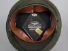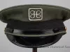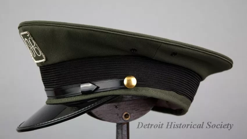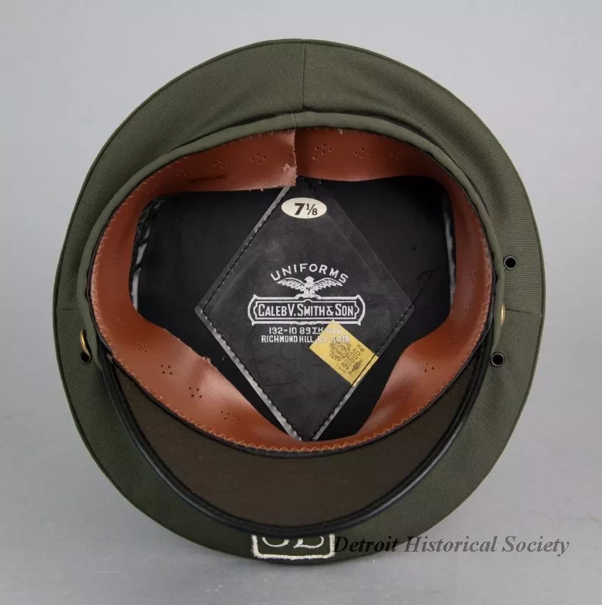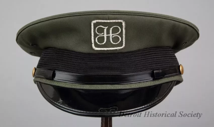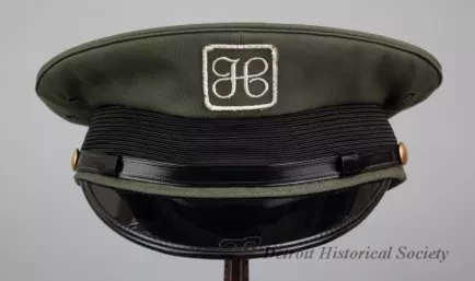 One J. L. Hudson Company deliveryman's uniform hat. The peaked hat has a green fabric top, a black fabric headband with a black vinyl strap across the front, and a black vinyl visor. The strap ends are attached at brass buttons that are located on the left and right sides of the hat. Two metal grommet vents are located in the green fabric above the brass buttons. The front of the hat has a decorative embroidered "H" emblem of the J. L. Hudson Company. A clear plastic label on the inside top of the hat reads "Uniforms, Caleb V. Smith & Son, 132-10 89th Ave., Richmond Hill, N.Y. 11418." A small union label is also sewn at the edge of the manufacturer's label. An oval-shaped adhesive label shows size "7 1/8." The hat has a black fabric lining and a brown vinyl headband on the inside.