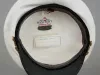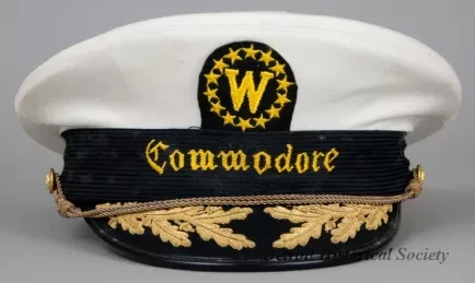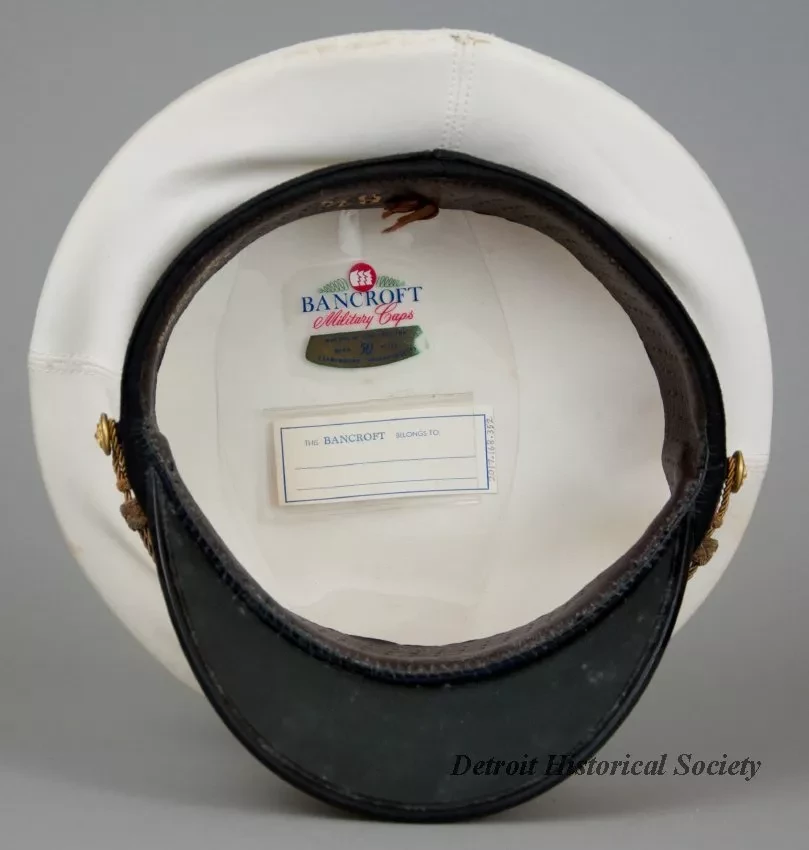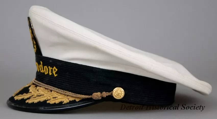 One peaked hat worn by a marine deck officer. The hat (size 6 7/8) has a white cloth top, a black headband with adjustable gold-colored cords across the front, and a black vinyl visor with applied gold-colored oak leaves. The cord ends are attached at brass buttons that are located on the left and right sides of the hat. The front of the hat has a decorative embroidered emblem that shows the letter, "W" of the Wilson Marine Transit Company inside a circle of stars. The word, "Commodore," is shown in gold-colored embroidered text beneath the emblem. A clear plastic label on the inside top of the hat shows "Bancroft Military Caps - Makers of Fine Caps for Over 50 Years, Framingham, Massachusetts." The adjacent identification tag is blank.