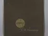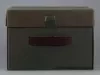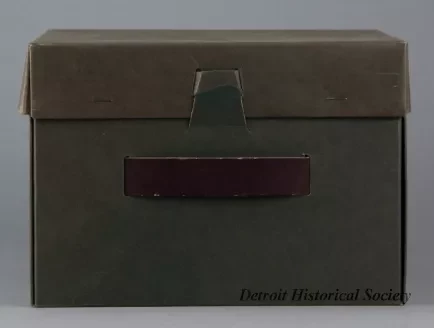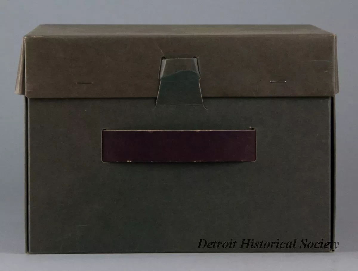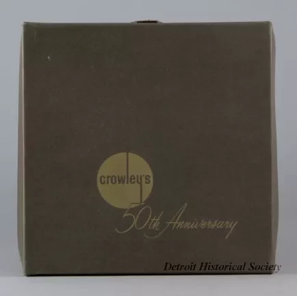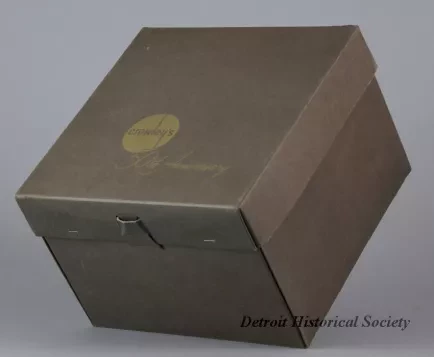 One hat box from Crowley's. The square box is made of cardboard that has a dark gray/green color on the exterior. It has a removable lid with gold-colored text stamped on top that reads "Crowley's, 50th Anniversary." Both the lid and bottom are made of pre-cut, ready-to-assemble pieces of cardboard that have been folded and stapled together in order to form the finished box. The bottom section includes a cardboard handle as well as two tuck-in cardboard clasps on opposite sides which secure the lid to the bottom.
