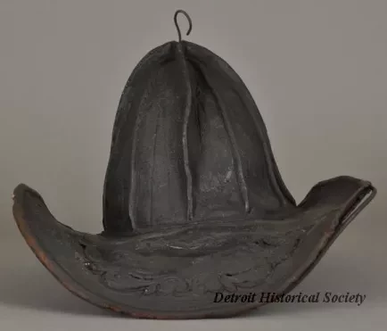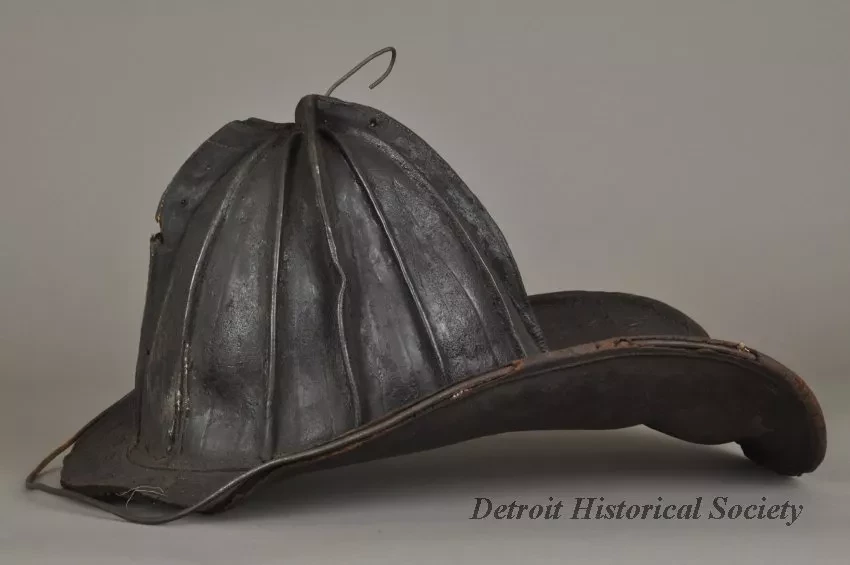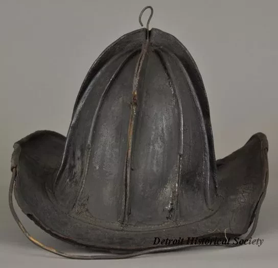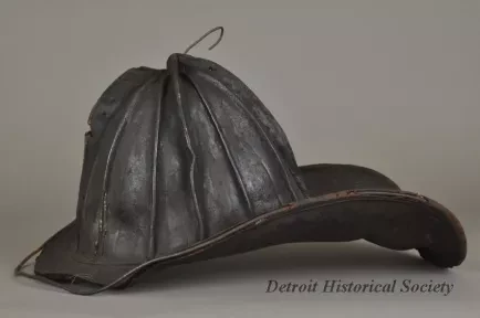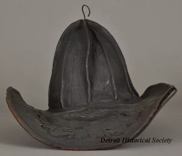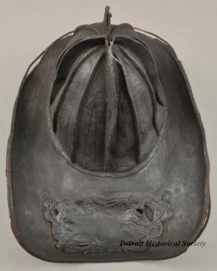 Fire helmet. Black leather "leatherhead" style firefighter's helmet with a tooled scrollwork design around its brim, culminating in a shield motif on the brim's rear. A heavy wire hook protrudes from its peak. Brown leather interior. This helmet belonged by Maurice F. Cousino, who was a member of Detroit's paid fire department at its inception. This is the helmet he wore while a member of Co. 6, one of the fire companies that went to Chicago fire in 1871.