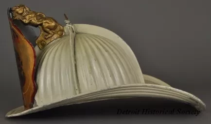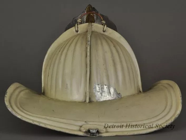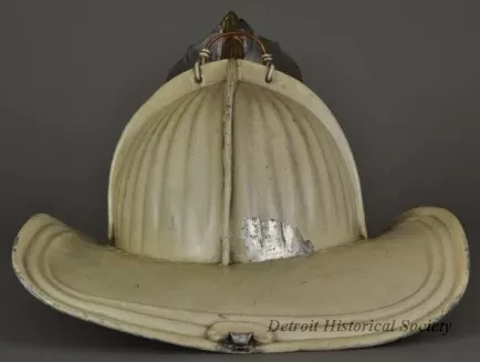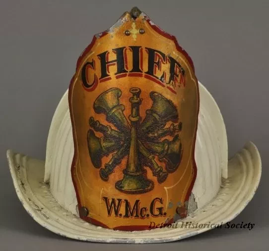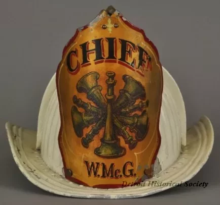 Fire helmet. Eggshell-colored metal fireman's helmet, with a curved backwards sloping brim and a gold-painted front emblem with red trim, upon which is painted, "Chief W. Mc. G," referring to its owner William McGraw, surrounding five crossed speaking trumpets, a symbol which detonates the rank of chief. The front emblem is supported by a crest shaped like the heraldic lion salient. An arch of heavy wire is looped through holes on either side of the lateral ridge on top of the helmet, likely so it can be hung up. Only tiny scraps of liner remain around rivets on the inside of the helmet.
