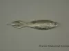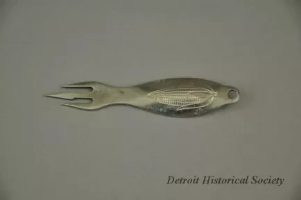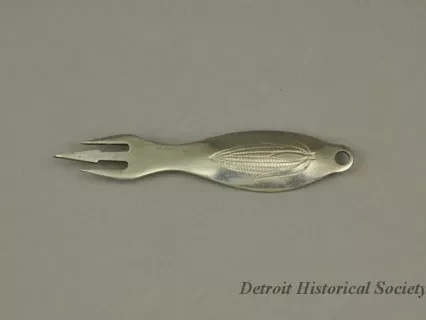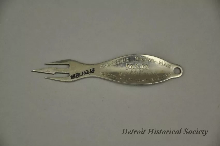 Silver Detroit and Cleveland Navigation Company corn holder. The utensil has three trident-like prongs, a convex oval-shaped handle, and a small hanging hole at the end of the handle. An ear of corn is engraved on the handle's recto, and "D&C Lake Lines, Detroit, Mich. Niagara Falls, Mackinaw Island, Chicago, Buffalo, Cleveland," is on the verso.