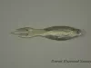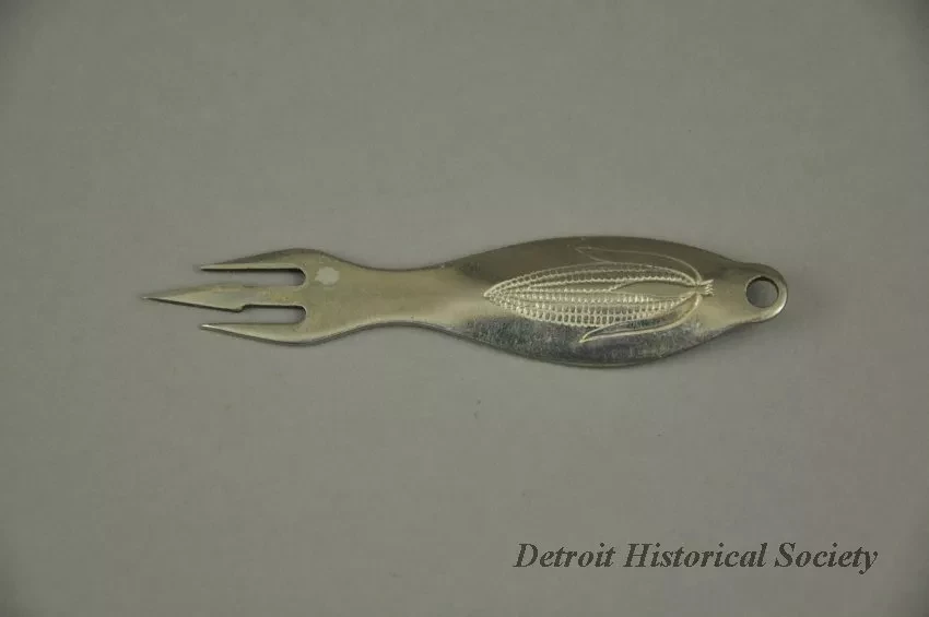 Silver Detroit and Cleveland Navigation Company corn holder. The utensil has three trident-like prongs, a convex oval-shaped handle, and a small hanging hole at the end of the handle. An ear of corn is engraved on the handle's recto, and "D&C Lake Lines, Detroit, Mich. Niagara Falls, Mackinaw Island, Chicago, Buffalo, Cleveland," is on the verso.