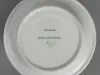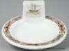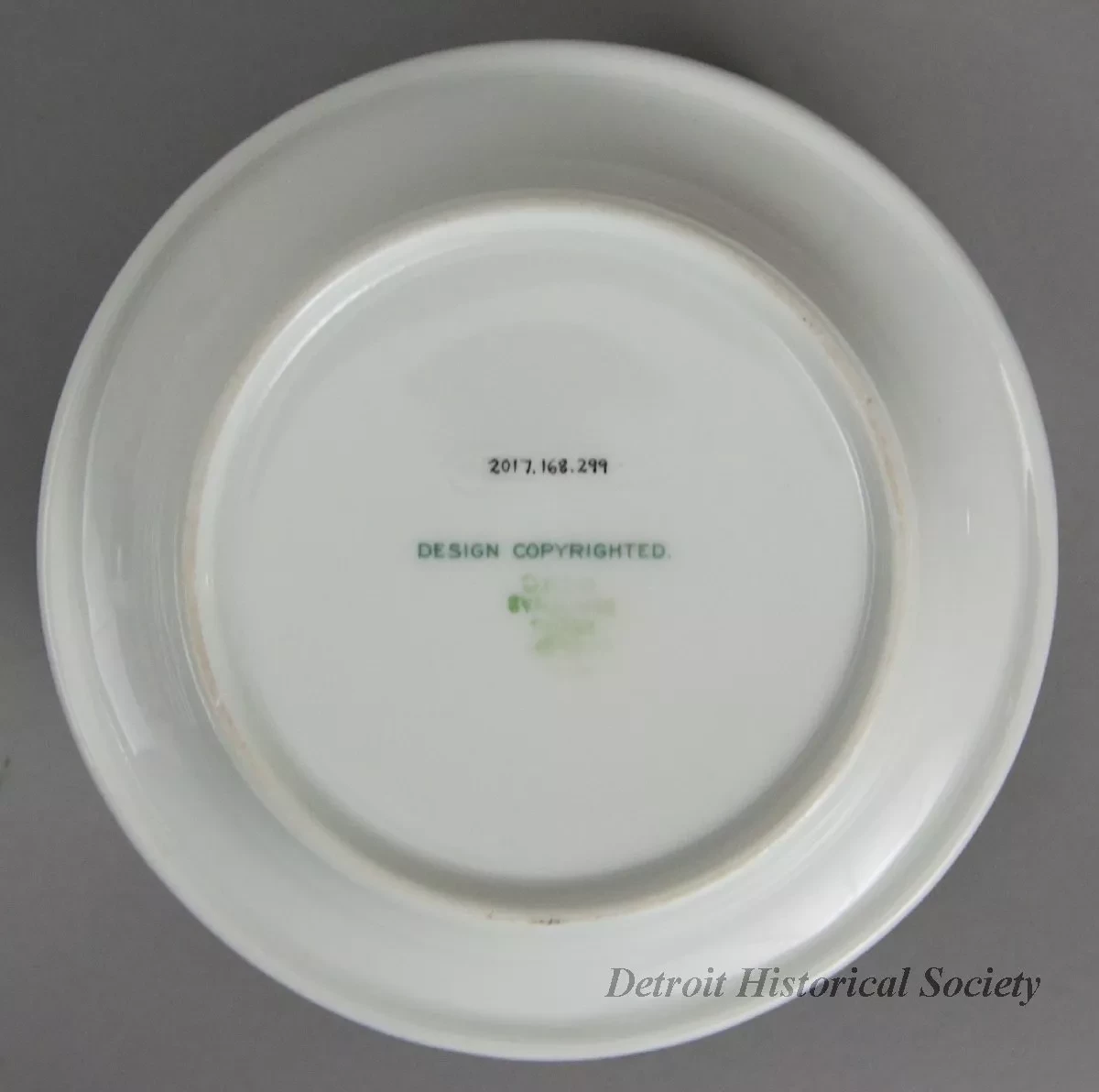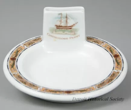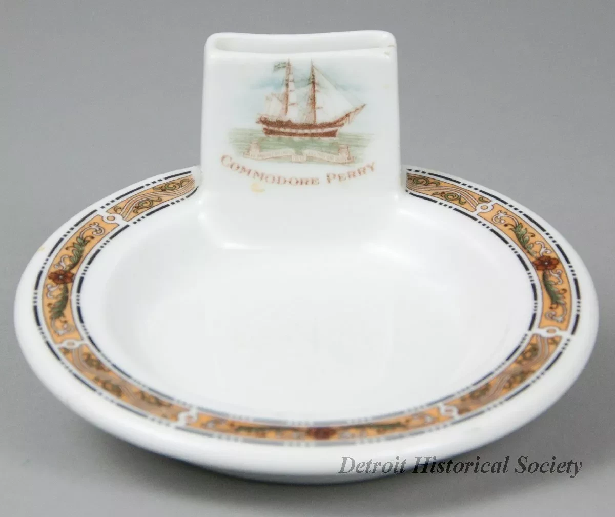 One matchstick holder from the Commodore Perry Hotel In Toledo, Ohio, which commemorates Commodore Perry's victory in the Battle of Lake Erie. The holder is made of heavyweight white glazed china. It consists of a small dish/ashtray which has a narrow flat rim that has been decorated with narrow black dashed stripes and a multi-color floral pattern. On one area of the rim, an upright, rectangular matchstick holder has been formed as part of the china. The front surface of the holder has a multi-color image of Perry's ship, Niagara, and red/brown text that reads "Commodore Perry." Additional small red/brown text reads "We have met the enemy and they are ours, 1812." Gray stamped text on the underside of the dish reads "Design Copyrighted," and "O.P. Co. [Onondaga Pottery Company], Syracuse China."