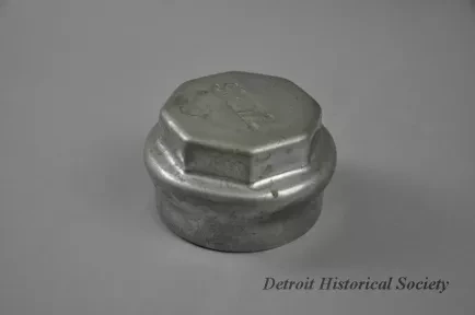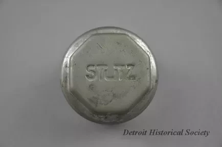 Request ImageOne (1) hubcap inscribed with "Stutz". Hubcap is circular in shape with a threaded base and made of chrome-plated steel. Center is raised octagon with depressed letters.