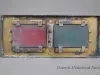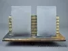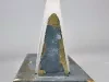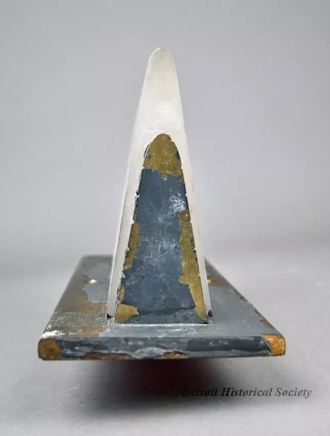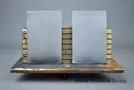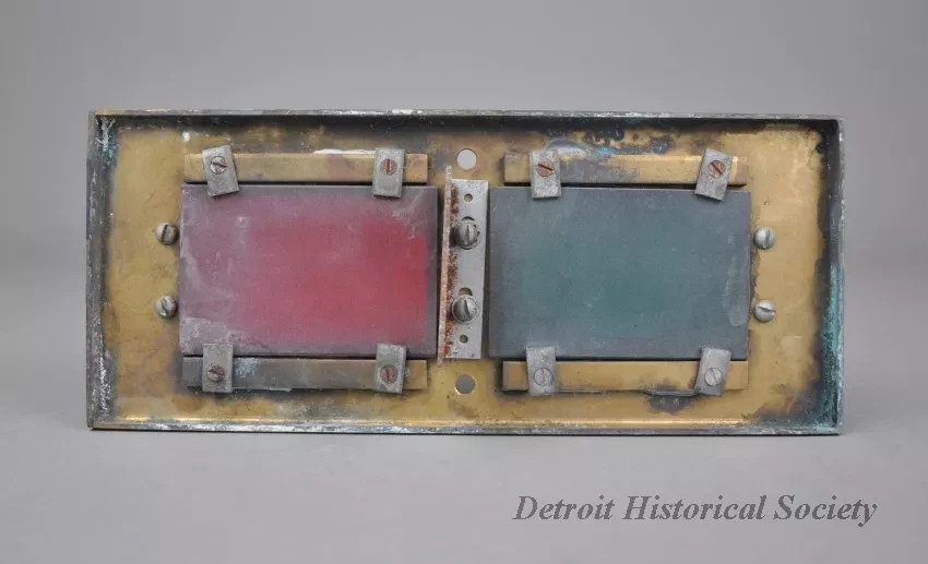 One floor indicator light fixture from an elevator on the 12th floor of the Woodward Avenue side of the J. L. Hudson Company store in downtown Detroit. The fixture has a rectangular brass base with a brushed exterior finish and dark green peeling paint. Two wedge-shaped pieces of opaque glass with a brushed finish extend outward from the base and are mounted between brass supports. Thin squares of colored glass are mounted at the base of each glass wedge (red on one and green on the other) and are concealed beneath the brass base. Presumably, electric bulbs, sockets, and wiring would have been concealed in the wall beneath the brass base since none of these items are included with the base.