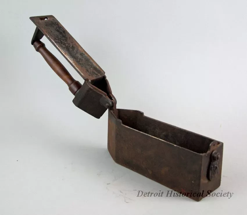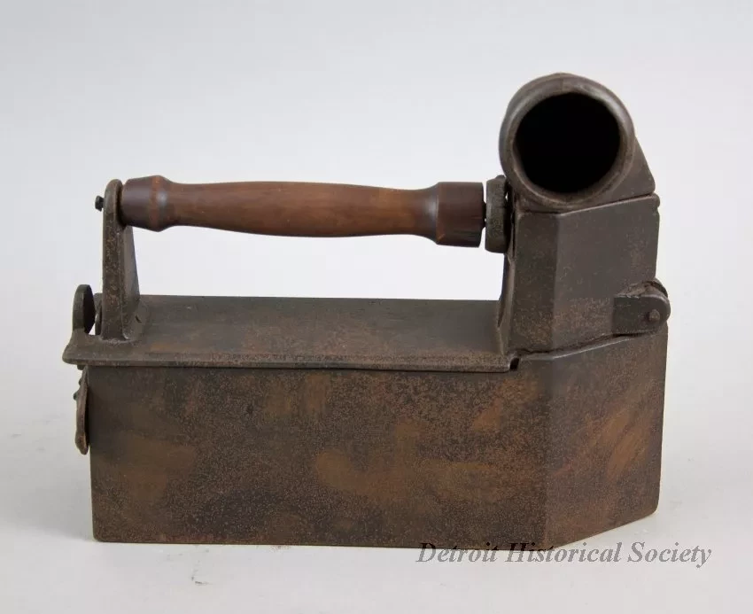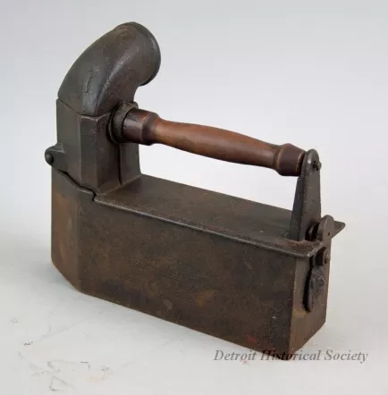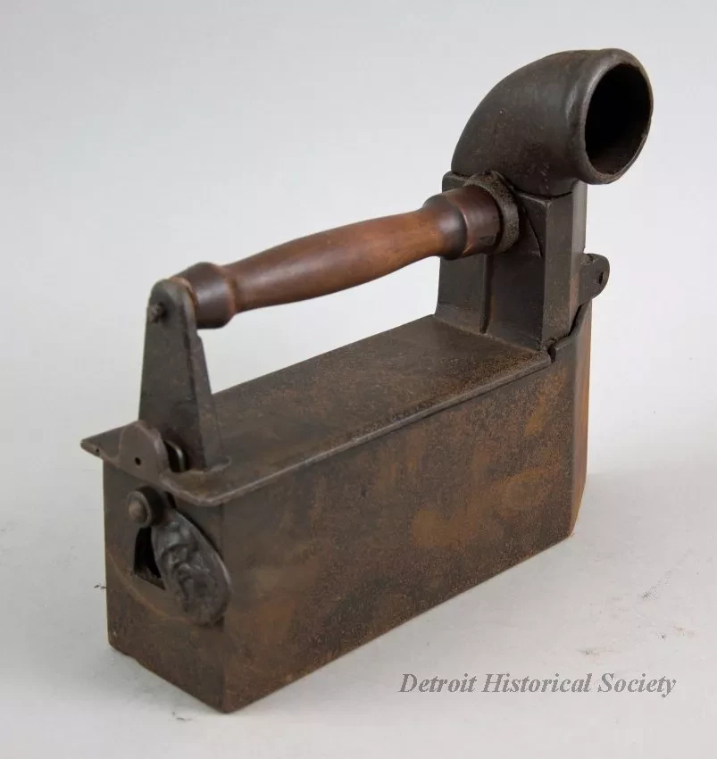 Iron: Flatiron: Charcoal-heated; "Tailor's Goose"; iron base is hollow with one end pointed and with a tube for draft running thru the bottom. Has a large chimney vent in front. Top is hinged in front and has wooden handle, fastens with a wire pin in back. Sliding draft cover on back of base has a raised image that depicts the face of a bearded man.
