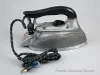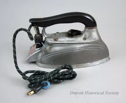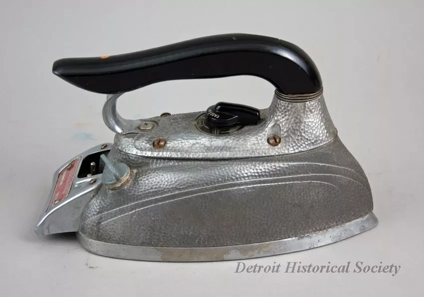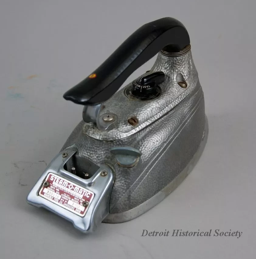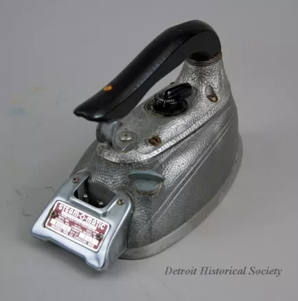 Electric iron made by Titeflex, Waverly Tool Company. Has grey hammered surface; black wooden handle; steam holes only in tip of pointed end; black cord plugs in top of heel rest; fabric settings and dial on center top beneath handle; red label on heel rest is marked: "Steam-O-Matic A Titeflex Product U.S. Patents 2,178,512...Serial No. 300178 Model No. B-30...Waverly Tool Co., Sandusky, Ohio." Has black/white fabric-covered electrical cord. Water for steam is poured through hole with metal plug at right side of handle.