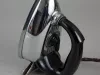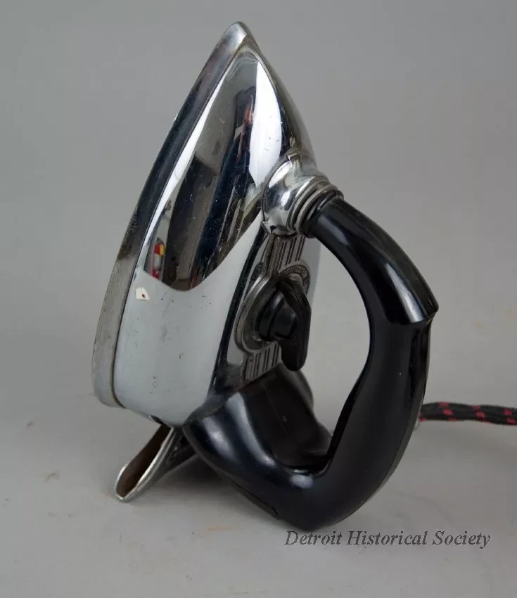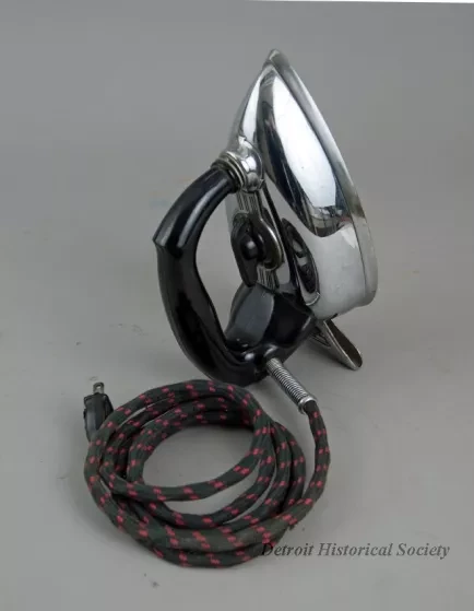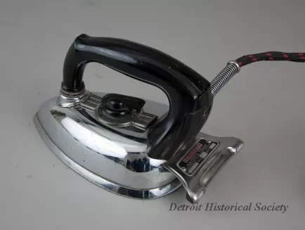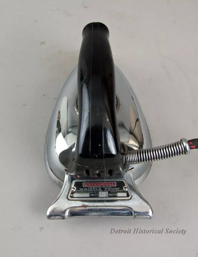 One "Universal" electric iron. The iron has a chrome-plated steel base, a black wood handle, and a black/red fabric-covered electric cord. An adjustable dial on top of the base allows different heat settings for various fabrics. A heel rest is located at the back of the base and includes a manufacturer's label plate. The iron was manufactured by "Landers, Frary & Clark, New Britain, Conn."