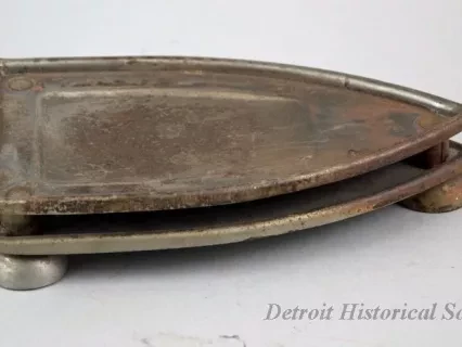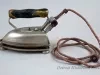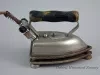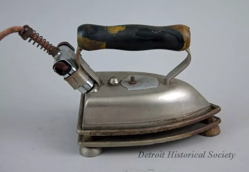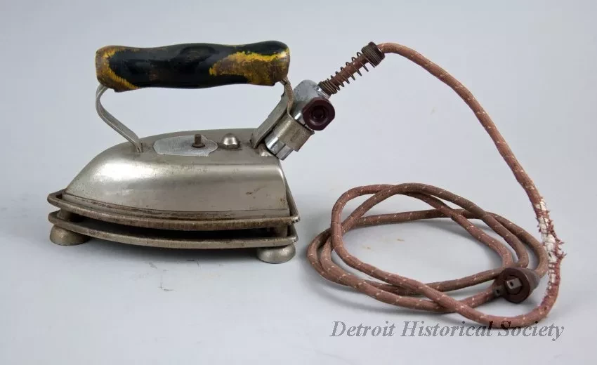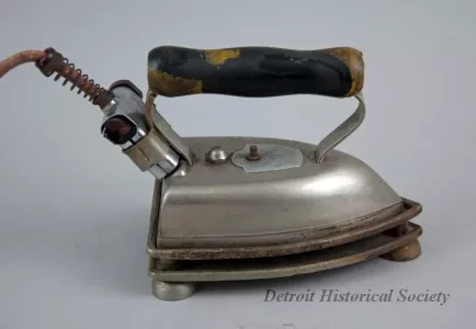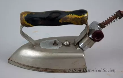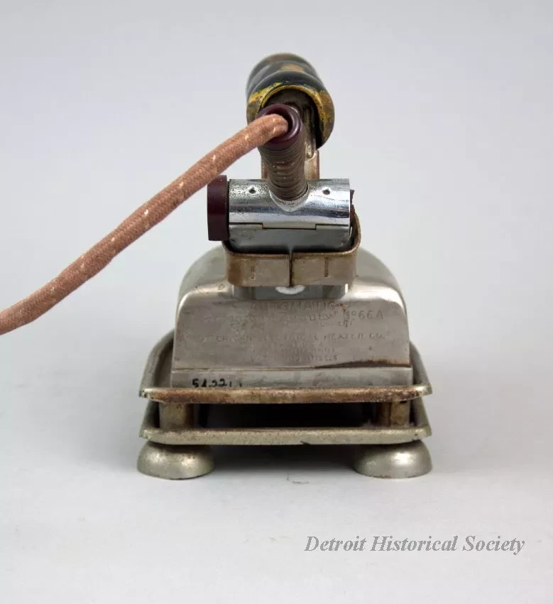 Electric flat iron. Marked on base: "American Beauty, Adjustable, Automatic Heat Control." Marked on heel: "Automatic "American Beauty," and "No. 66A For Alternating Current, Made By American Electrical Heater Co. Detroit, U.S.A., Pat. Nos. 1096926, 1170166, Volts 110-120, Watts 525." Has brown and white cloth cord and wooden handle painted black. (See iron stand, 1954.321.002.)