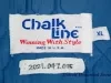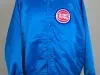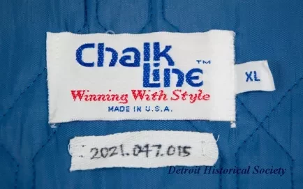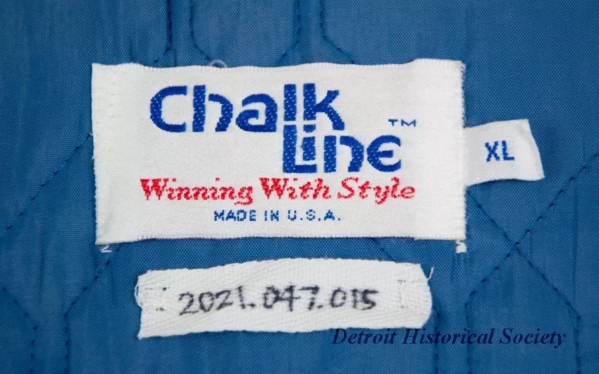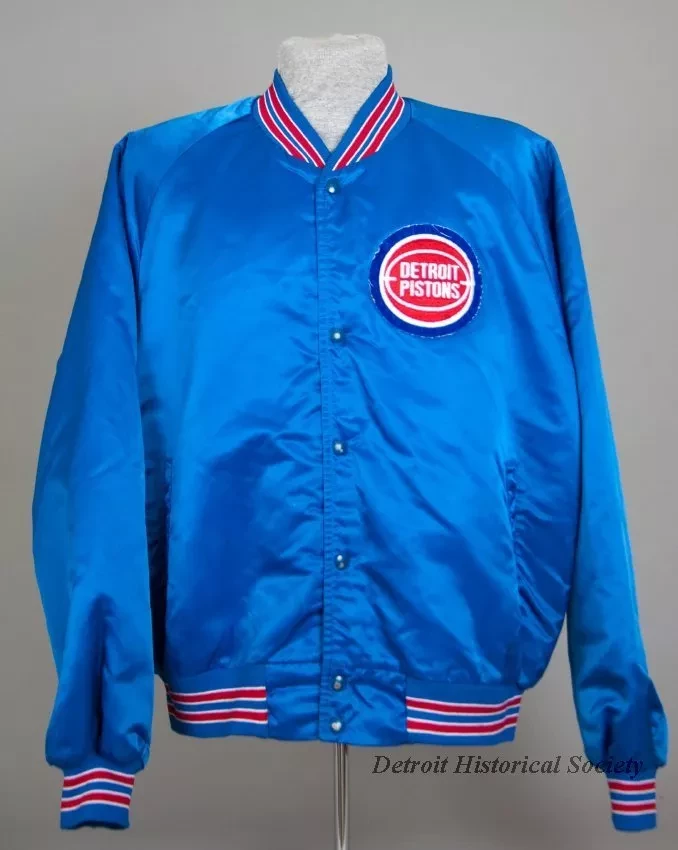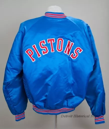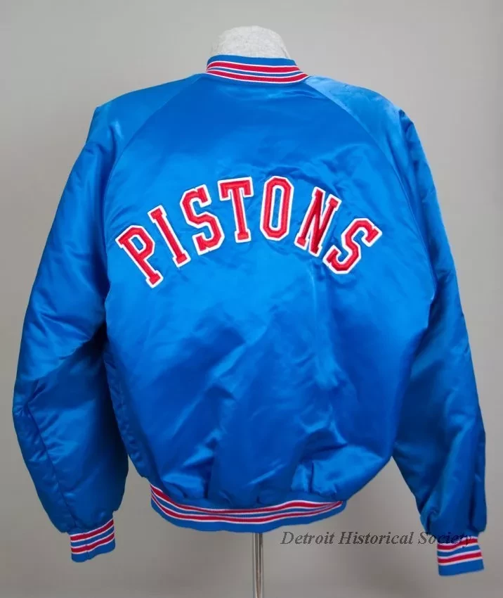 One "Detroit Pistons" fan jacket. The long sleeve jacket has an iridescent blue polyester fabric exterior with a quilted blue rayon/polyester lining. It has a short rounded collar made of elastic knit fabric with narrow red/white/blue stripes, six metal snap closures down the center, slash pockets on each side, and an embroidered "Detroit Pistons" logo patch on the left breast. The cuffs and waistband are finished with elastic knit fabric that matches the collar. Embroidered red/white lettering patches that read "Pistons" are sewn along an arc across the back of the jacket. A white fabric manufacturer's label on the inside back collar has red/blue text that reads "Chalk Line, Winning With Style" as well as "Made in U.S.A" and "XL." A small white fabric label on the inside left side seam has black printed text that gives fabric information and washing instructions.