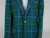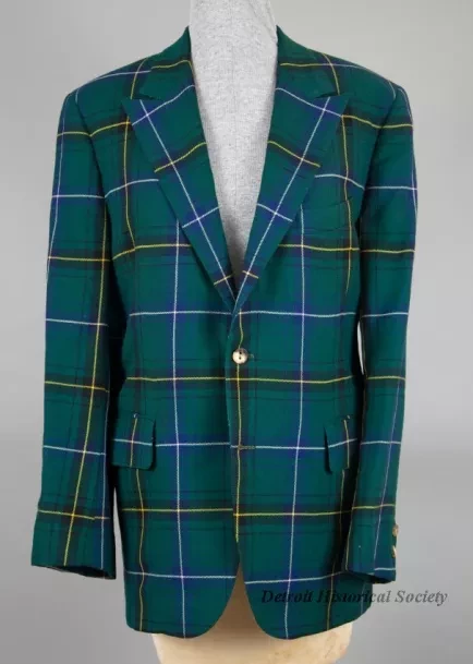 Men's wool jacket with a pine green, navy, white, and yellow tartan weave. The exterior of the jacket has pointed lapels, two side pockets with flaps and the back of the collar is trimmed with pine green wool felt. The jacket has two horn button closures at center front. The jacket has long narrow sleeves lined with ivory (silk or acetate) and two decorative horn buttons at each cuff. The jacket is half-lined with pine green silk and has two interior breast pockets. A fabric manufacturer's label on the interior collar reads "Chippworth" and another fabric manufacturer's label on the interior front right panel reads "Chippworth, New York, New Haven."