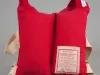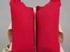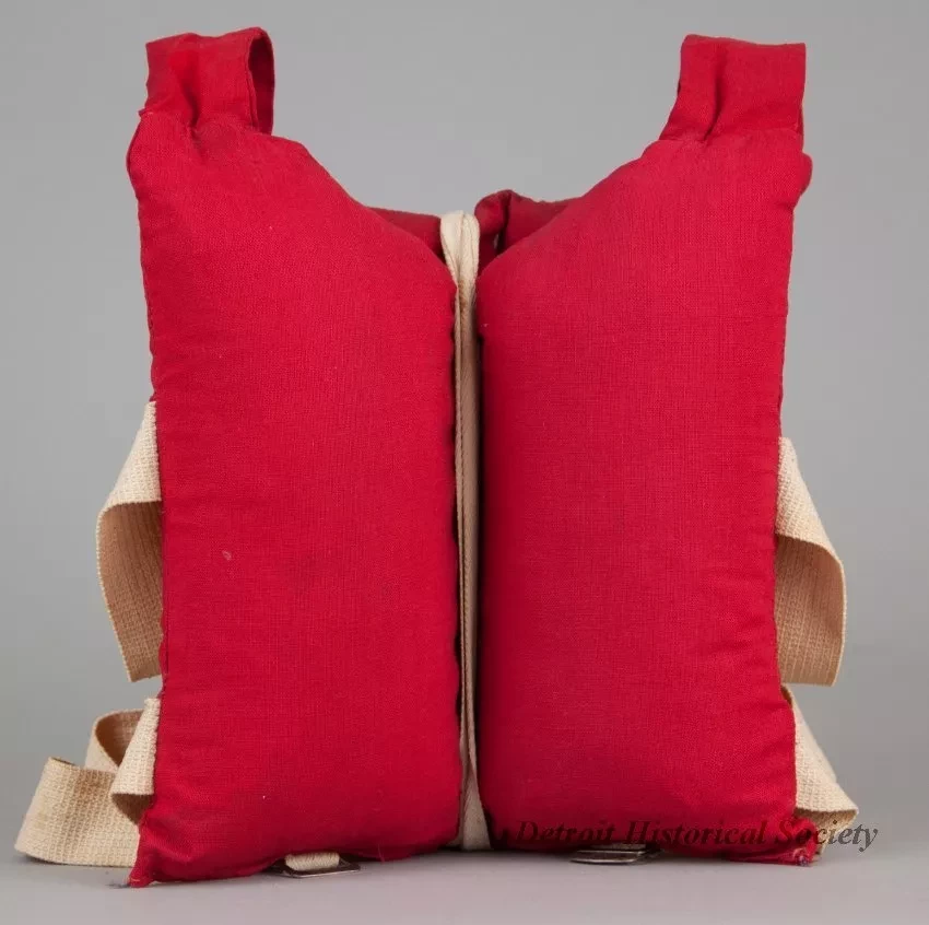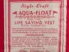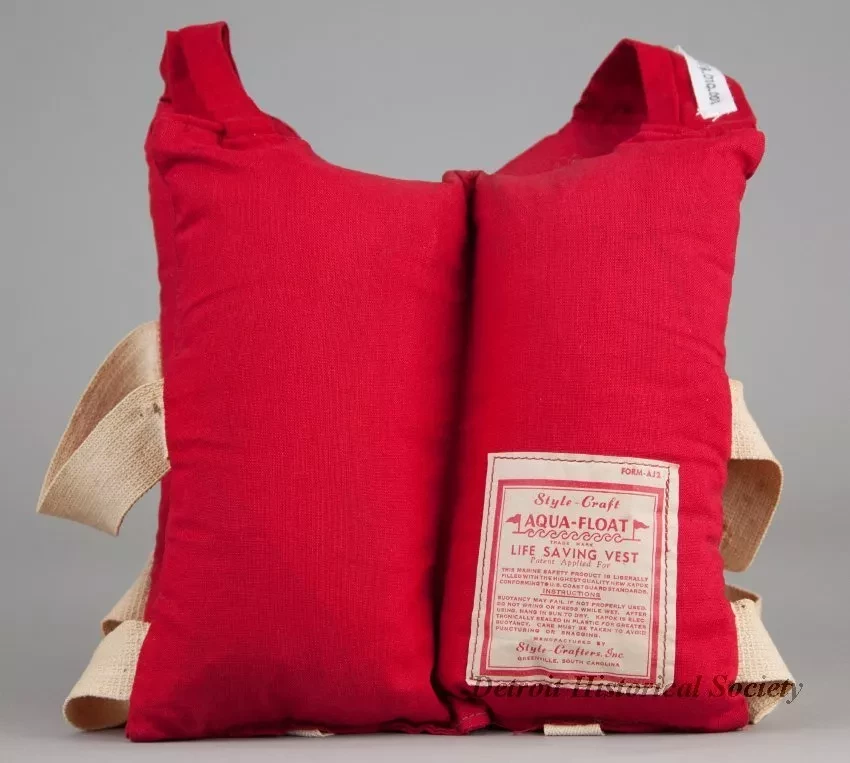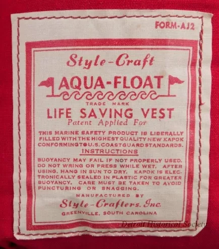 One child's life jacket. The vest-style jacket is made of red cotton canvas with four vertical rectangular sewn pockets around the body that contain kapok for flotation. The jacket has two white canvas straps on each side and two long ties which would pass beneath the child's legs and attach to metal buckles on the lower front edge. A label on the jacket inside reads "Style Craft, Aqua-Float, Life Saving Vest," and "This Marine Safety Product is Liberally Filled with the Highest Quality New Kapok Conforming to U.S. Coast Guard Standards." An "Instructions" section of printed text is also shown. The jacket was "Manufactured by Style-Crafters, Inc., Greenville, South Carolina."