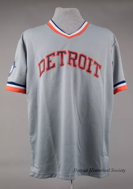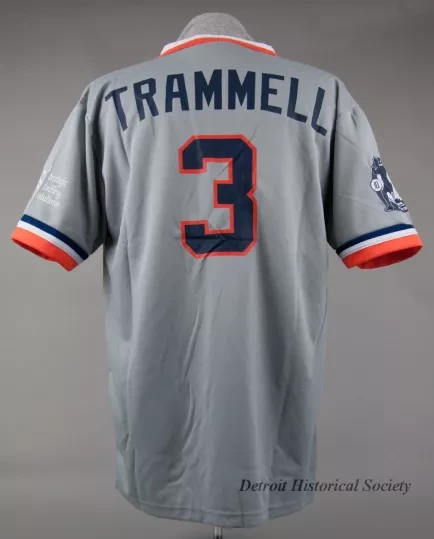 One Detroit Tigers replica baseball jersey to celebrate the retirement of number, "3," which belonged to former player, Alan Trammell. The short-sleeve pull-over jersey is made of lightweight gray polyester fabric. It has a V-neckline and a straight hemline along the lower edge. The edges of the collar and sleeves are trimmed with layered bands of blue/white/orange fabric. "Detroit" is stamped in orange/blue text across the front of the jersey. The name, "Trammell," is stamped in blue text on the back along with the number, "3," in orange/blue text. The left sleeve is stamped with white script text that reads "S3, Strategic Staffing Solutions." The right sleeve has a circular, iron-on blue/white baseball player silhouette patch with a facsimile signature and blue/white text that reads "Alan Trammell, 3, Number Retirement." A label on the inside back of collar reads "Coyote Promotions, L,100% Polyester," and gives washing instructions.