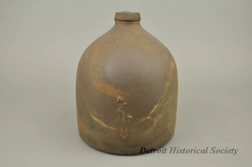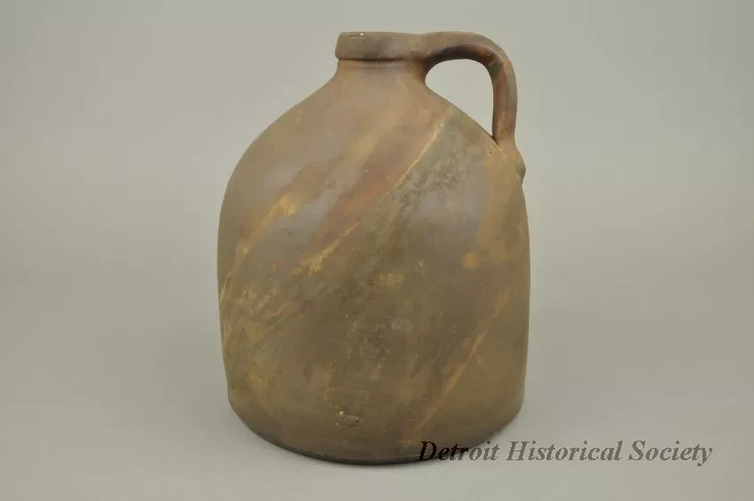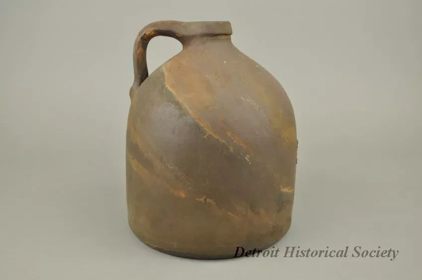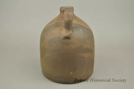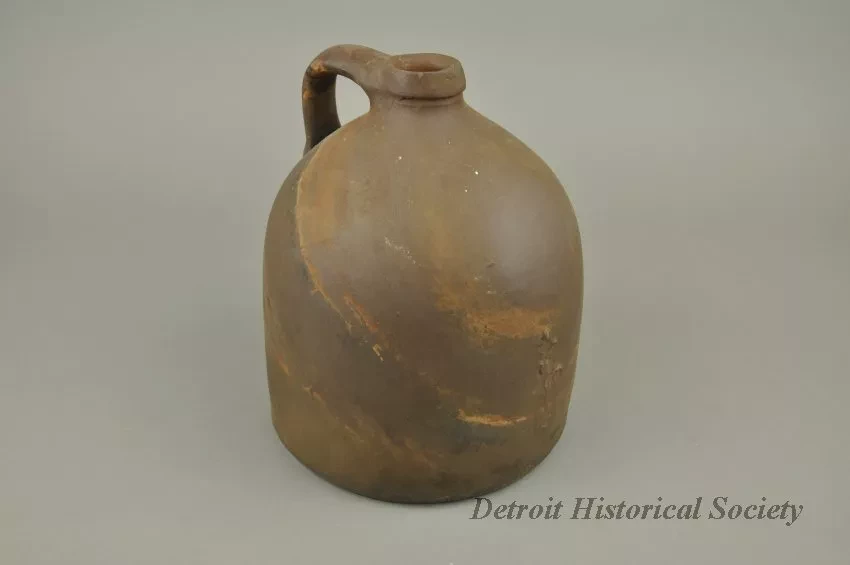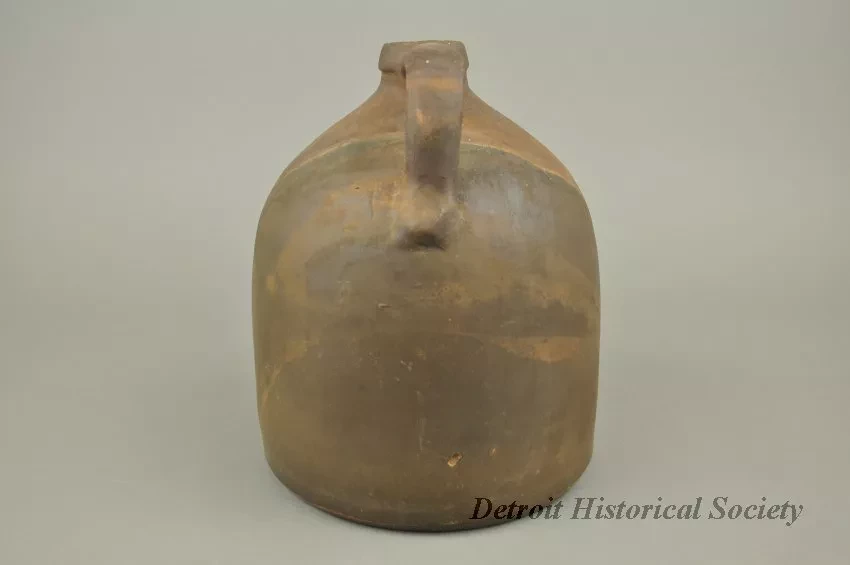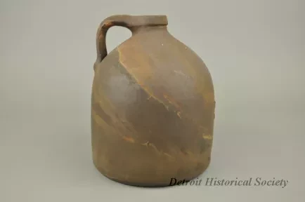 Jug: brown glazed heavy ceramic jug; small handle; recovered from wreck of the schooner ALVIN CLARK, which foundered in 1864.
