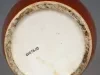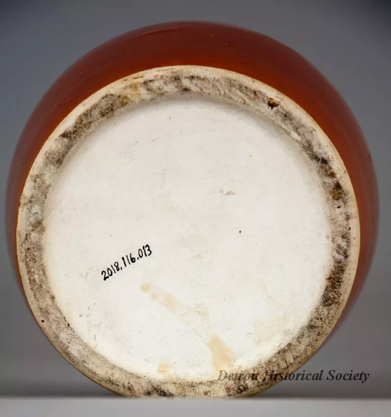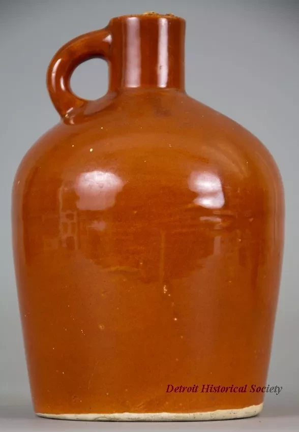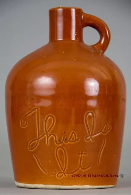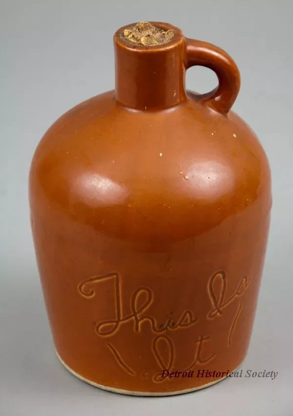 One whiskey jug. The stoneware jug has a red/brown glazing. It has a short neck with a 1.125-inch diameter opening, a broken cork stopper, a small round handle at the side of the neck, a rounded top, and sides that curve slightly down to a flat base. Inscribed text on one side reads "This Is It!" No manufacturer's name or marks are shown.