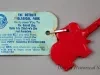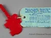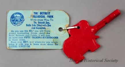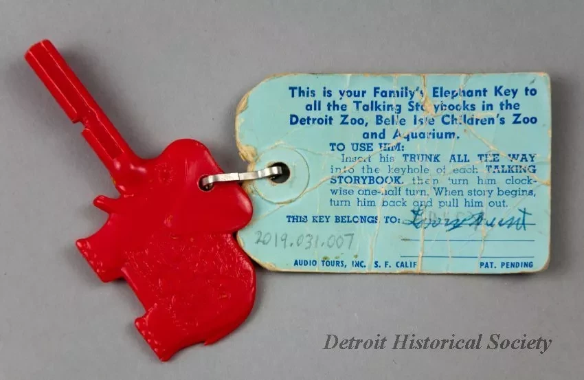 One zoo key from the "Detroit Zoological Park." The key is made of red plastic and is shaped like an elephant. The elephant's trunk can be inserted into a "Talking Storybook" box at each zoo exhibit and a recorded message gives information about the exhibit. A light blue paper tag is attached to the key with a metal clip. Printed text on the tag gives operating instructions for the key and includes blank lines for a child to fill in his/her name. The key was produced by "Audio Tours, Inc., S.F., Calif."