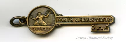 One commemorative key charm from the period when Roman S. Gribbs was mayor of Detroit (1970-1974). The "Spirit of Detroit" statue is depicted and the inscription reads, "Detroit, Roman S. Gribbs Mayor." The key is made of brass and has a ring attached so it can be used as a charm.