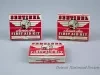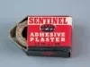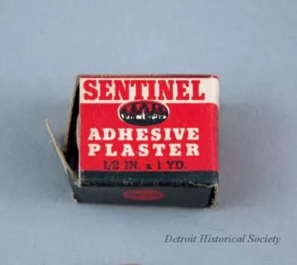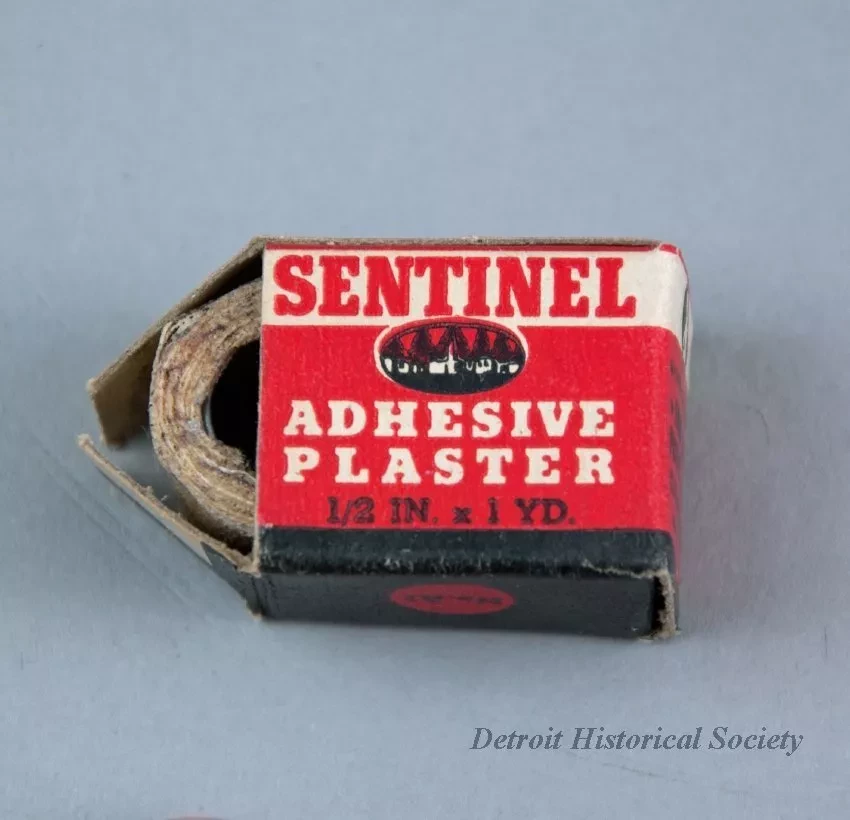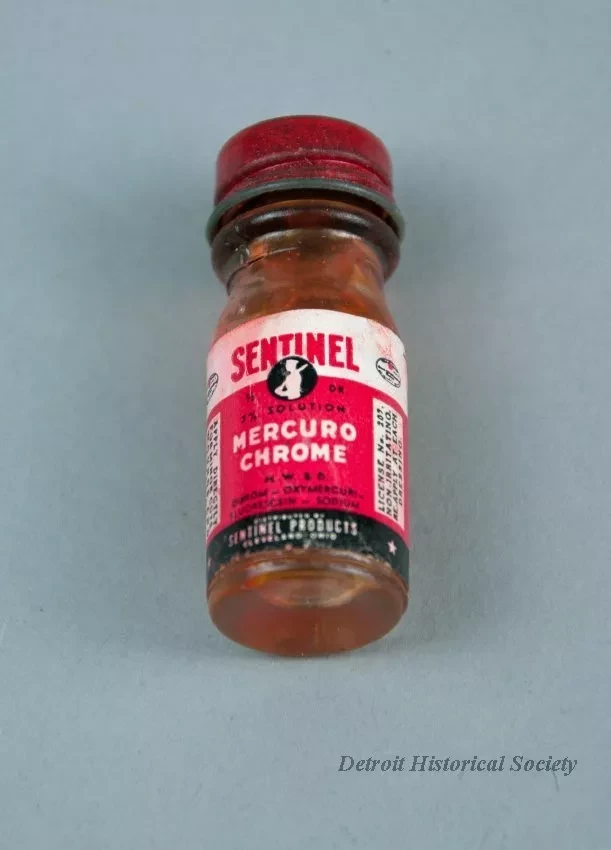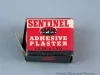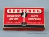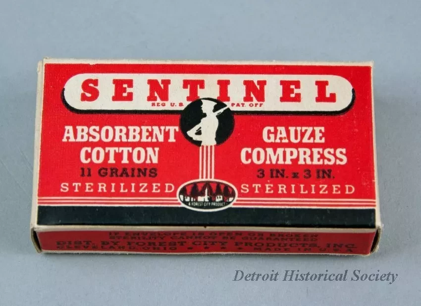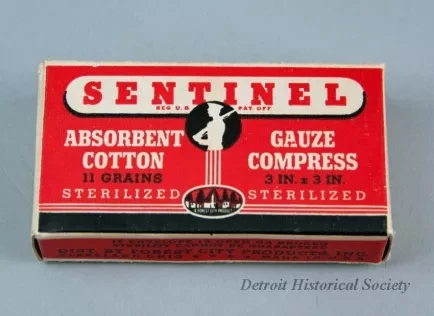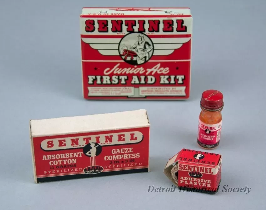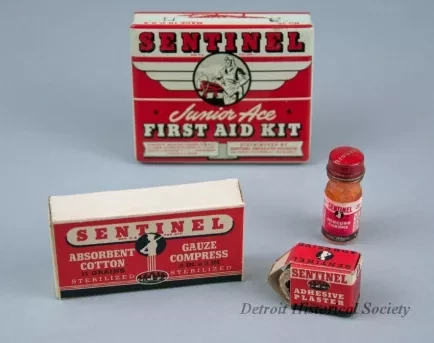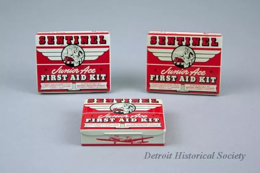 Three Sentinel Junior Ace First Aid Kits in rectangular tin boxes with hinged lids. Each box has a red and white lid with image of an aviator standing in front of an airplane and the words, "Sentinel, Reg. U. S. Pat. Off., Junior Ace, First Aid Kit," and "Distributed by Sentinel Products Division, The Forest City Rubber Co., Cleveland, O." Each kit contains a small glass bottle of mercurochrome (now dried up), a cardboard box containing an adhesive plaster, and a box that originally contained cotton balls (now missing).