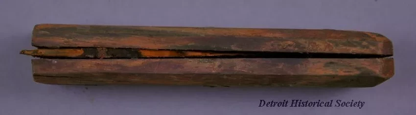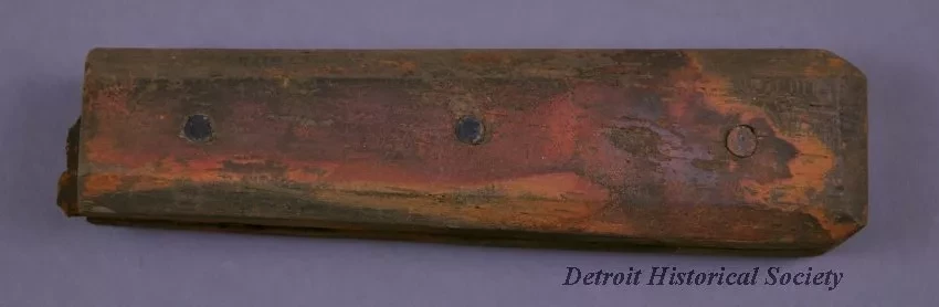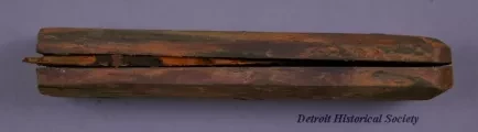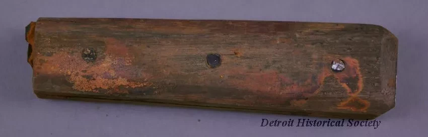 Knife Handle. Two-part wooden handle with beveled edges held together by three metal rivets; portion of rusty, broken blade remains within; some remains of a coating (perhaps paint or varnish) still visible; predominately stained orange from rust; recovered from wreck of the schooner ALVIN CLARK, which foundered in Lake Michigan in 1864.