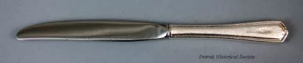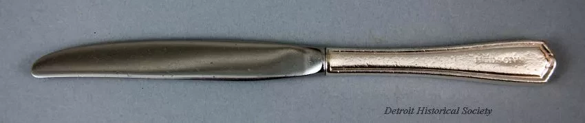 One dinner knife from the 13th floor restaurant at Hudson's downtown Detroit store. The knife is made of stainless steel with a polished blade and non-serrated cutting edge. The handle has a traditional Chippendale-style design with a lightly hammered, silverplate finish. One side of the handle has stamped text that shows "Hudson's."